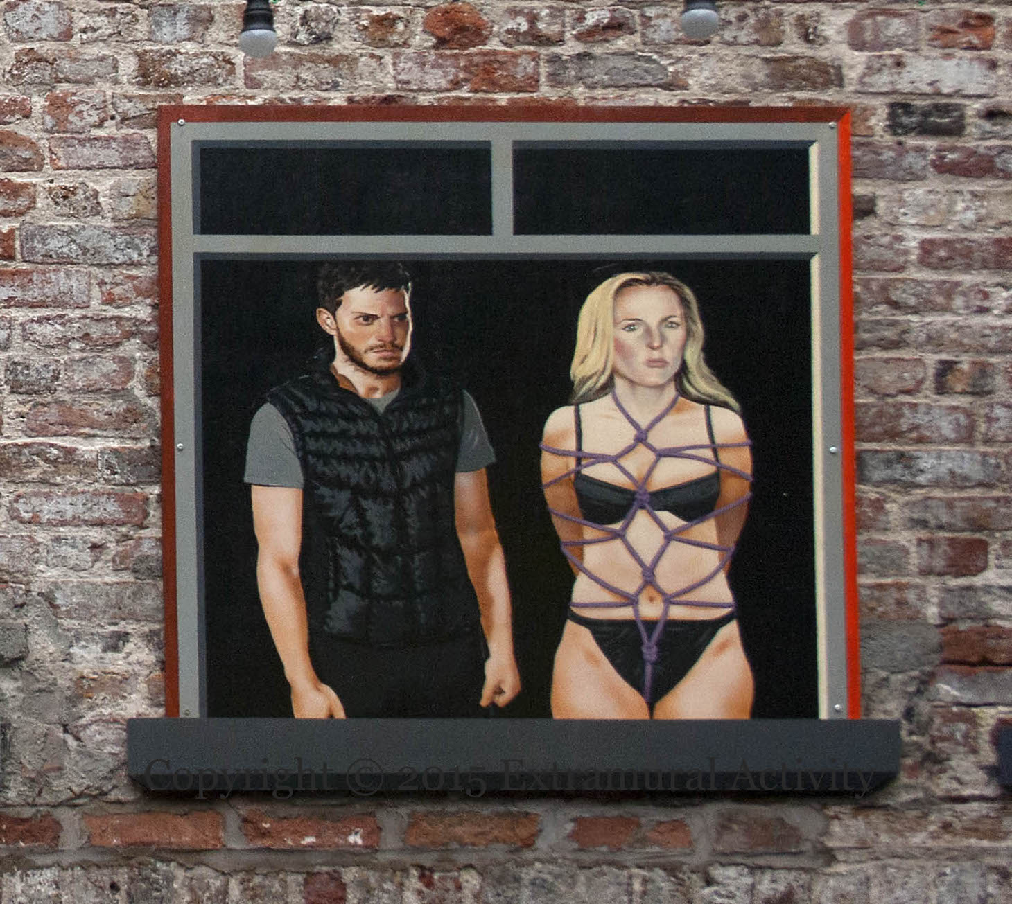 Jamie Dornan (from Holywood) and Gillian Anderson are stars of the BBC series The Fall. He plays a serial-killer terrorizing Belfast and she the detective leading the investigation. Anderson is not shown here as she appears in The Fall, but in the style of Fifty Shades OfGrey, the BDSM-explicit novel by E. L. James, which has now been made into a movie, starring Dornan. It goes on general release tomorrow, Valentine’s Day, February 14th.