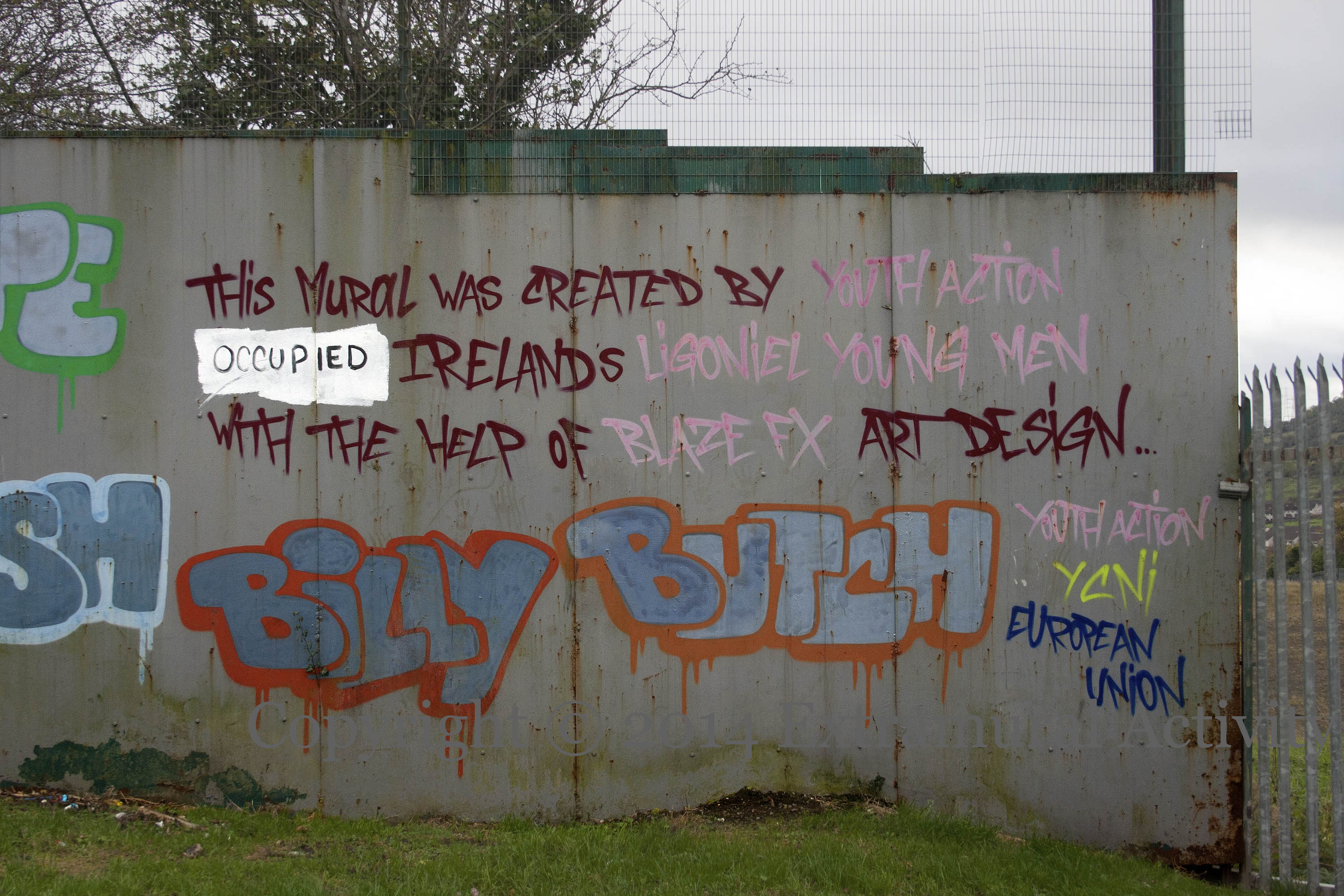 “This mural was created by Youth Action, occupied Ireland’s Ligoniel Young Men with the help of Blaze FX Art Design.” Previously it read “Northern Ireland”. The mural includes one youth gazing down into the city, the bus coming up to Ligonield, two spray-paint artists painting the mural and (just off to the left) two boys fishing.