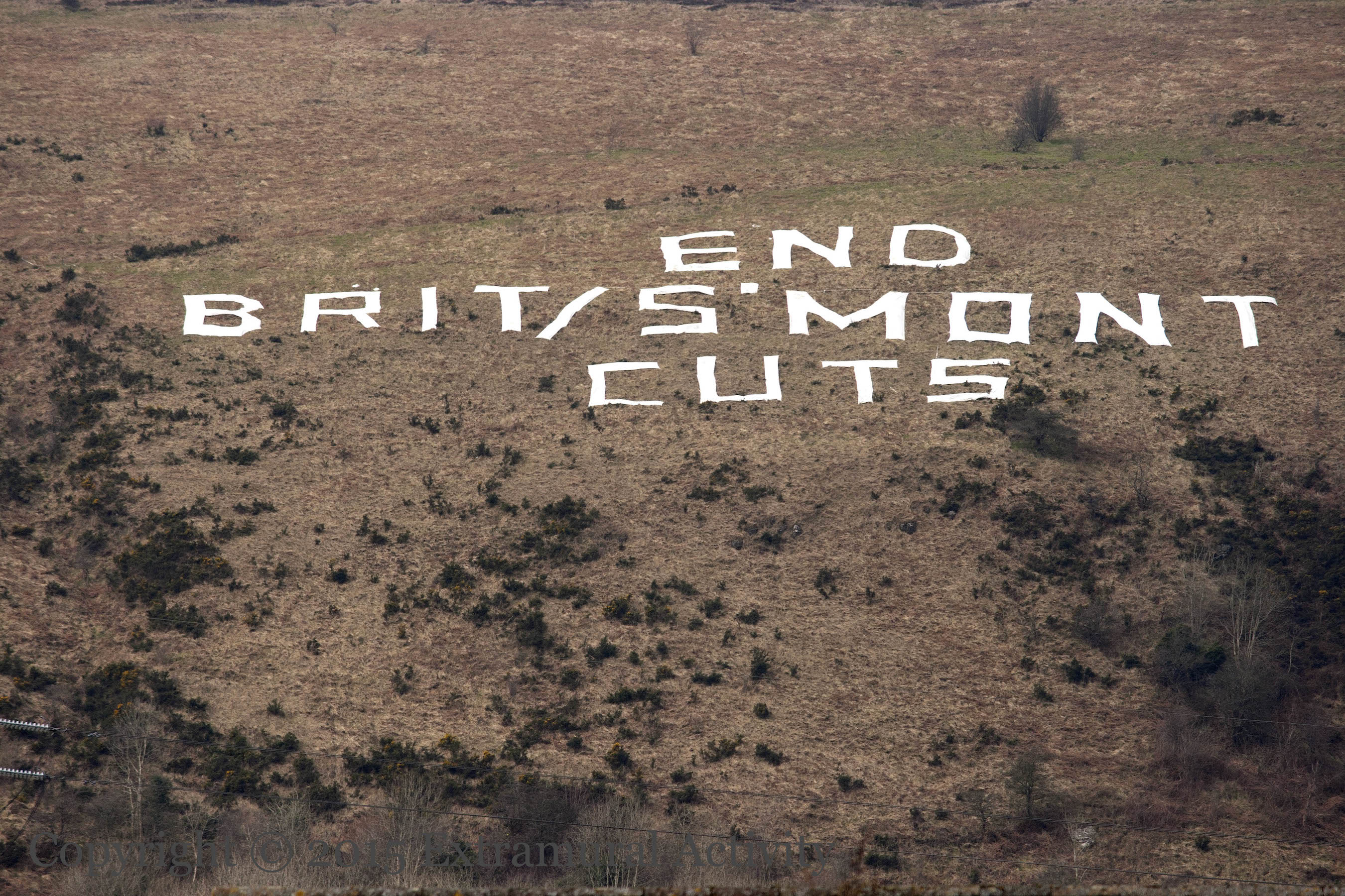 As wrangling over the Welfare Reform Bill continues (with the extra layer of difficulty that comes with politics in these parts), Gael Force Art (Fb) have unveiled their latest message on the mountain (Sliabh Dubh), in support of a strike on the 13th by public sector workers (BBC-NI): End Brit/S’mont Cuts.
