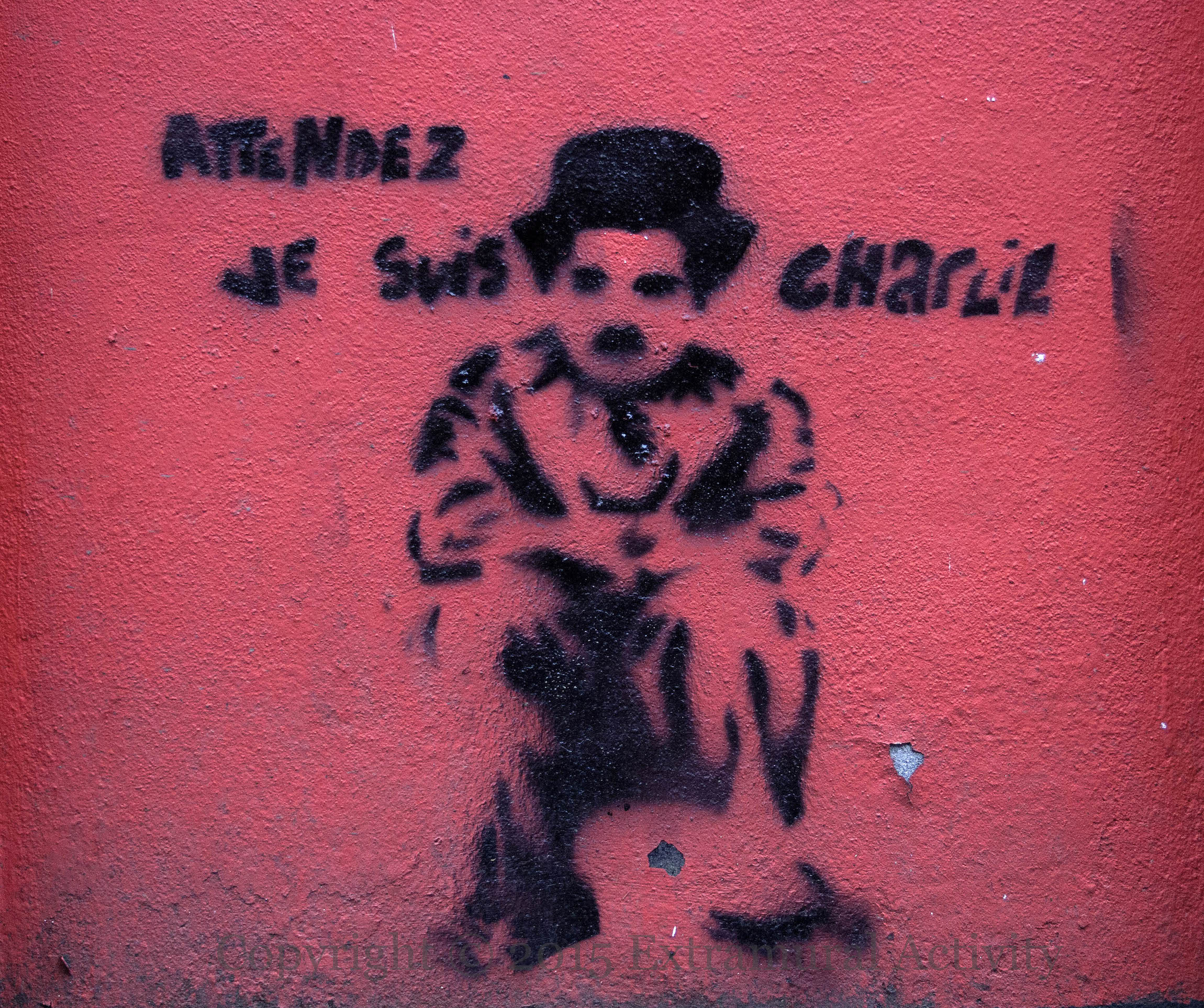 Charlie Hedbo, the satirical Parisian weekly which became internationally known after a gun attack in January in which 12 were killed, is named after Charlie Brown (from Charles Schultz’s Peanuts) but the Charlie Chaplin above (as seen in The Kid) uses French to try to claim the name for himself. Chaplin and his family settled in French-speaking Switzerland after he was denied entry to the US as part of Joseph McCarthy’s witch-hunt of artists with alleged communist sympathies (WP). Stencil by Patrick Devlin in the city centre. See previously: Blowing My Mind | Mr. Lee | The Passion