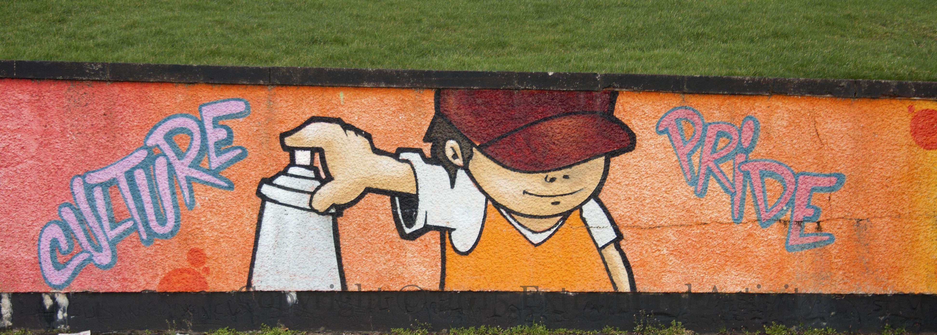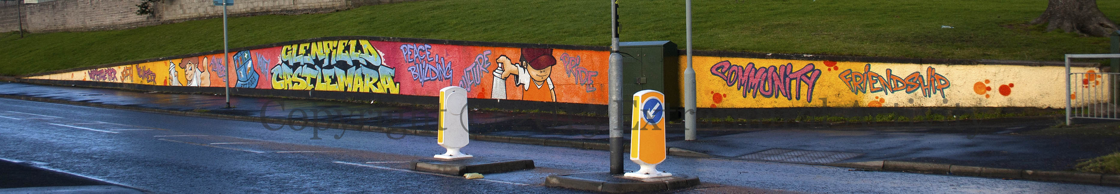 Spray painting is an approved type of youth activity in this Glenfield/Castlemara community mural on a low wall on Oakfield Drive. You can see the ‘coat of arms’ (from the wide shot, below) of the Glenfield Community Association more clearly via their Facebook page.