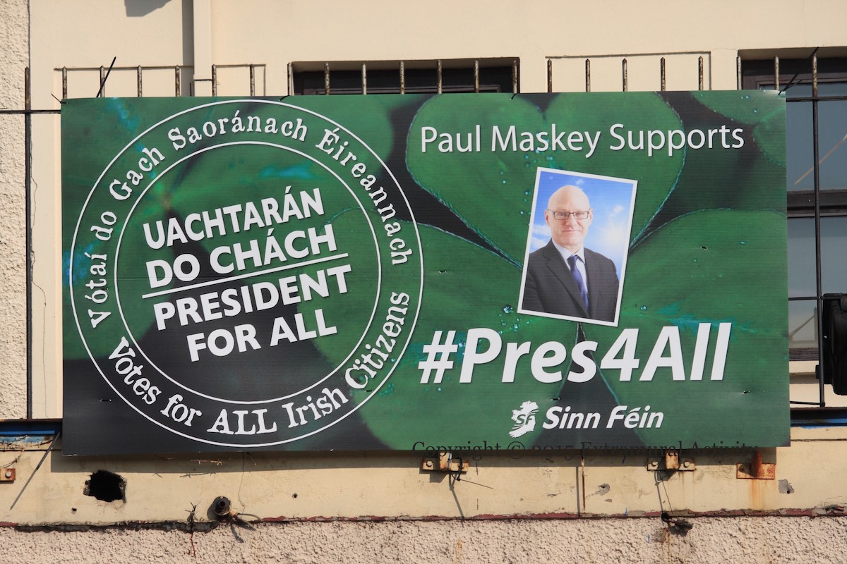 “Paul Maskey supports votes for ALL Irish citizens.” Eligibility for voting in the Presidential election is based on eligibility for voting in Dáıl elections, which requires being a resident in a Dáıl constituency. As such, non-residents – whether in Northern Ireland or elsewhere – are not eligible. The matter was among those take up by the recent Constitutional Convention and a reply from the government is expected by the end of May (WP). Maskey is the incumbent for West Belfast in May’s Westminster election.