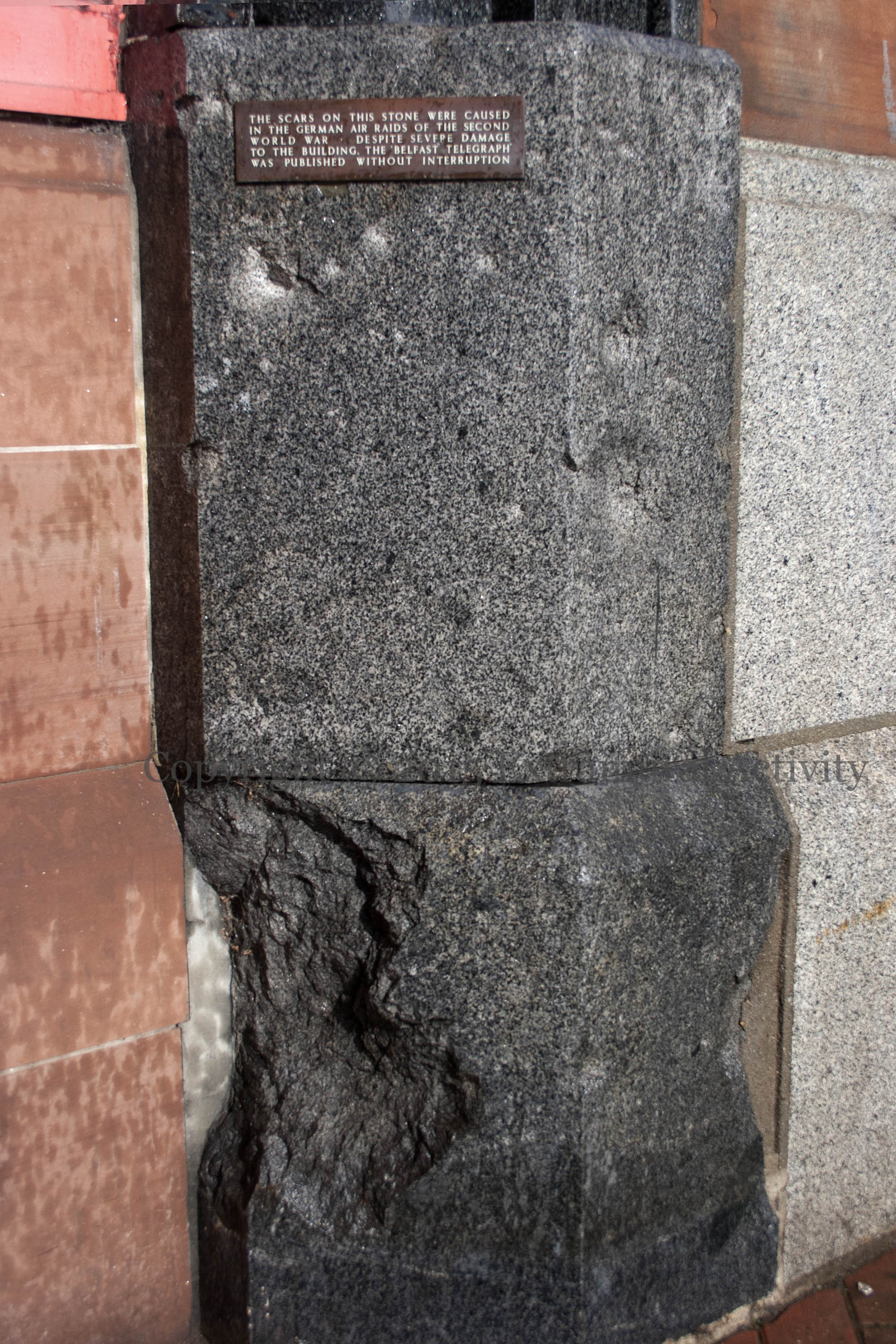 “The scars on this stone were caused in the German air raids of the second world war. Despite severe damage to the building, the Belfast Telegraph was published without interruption.” The masonry above forms part of what was the old front door of the offices, at the corner of Royal Avenue and Library Street.