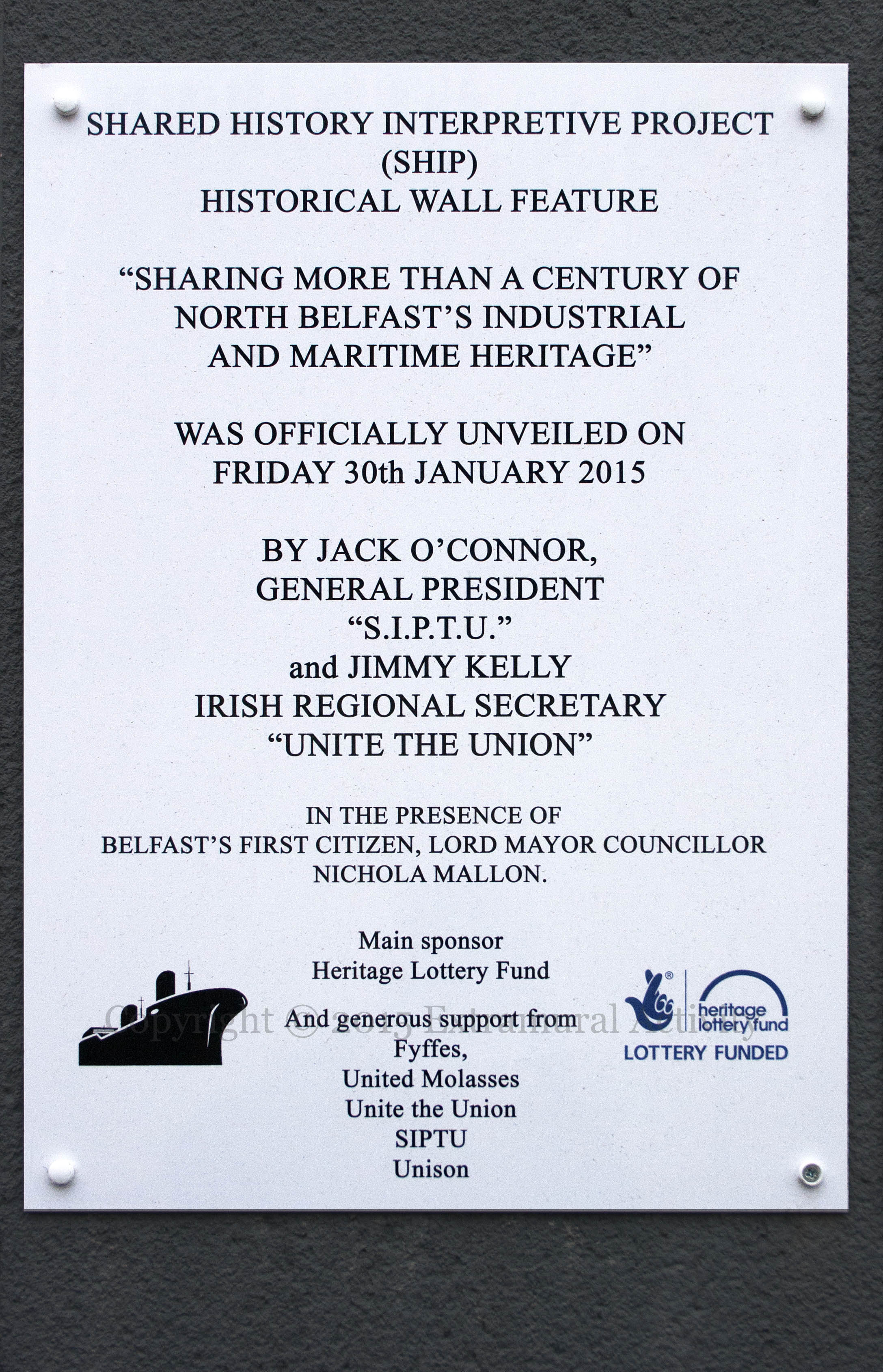 X02573 X02574 X02575 “Sharing more than a century of north Belfast’s industrial and maritime heritage” was officially unveiled on Friday 30th January 2015 by Jack O’Connor, General President “SIPTU” and Jimmy Kelly Irish regional secretary “Unite The Union” in the presence of Belfast’s First Citizen, Lord Mayor Councillor Nichola Mallon. Main sponsor Heritage Lottery Fund and generous support from Fyffes, United Molasses, Unite the Union, SIPTU, Unison. a fine fine meal gallaghers snuff itgwu obu the mission to seafarers elders travel liverpool park drive tall ships may day one big union itgwu irish transport general workers