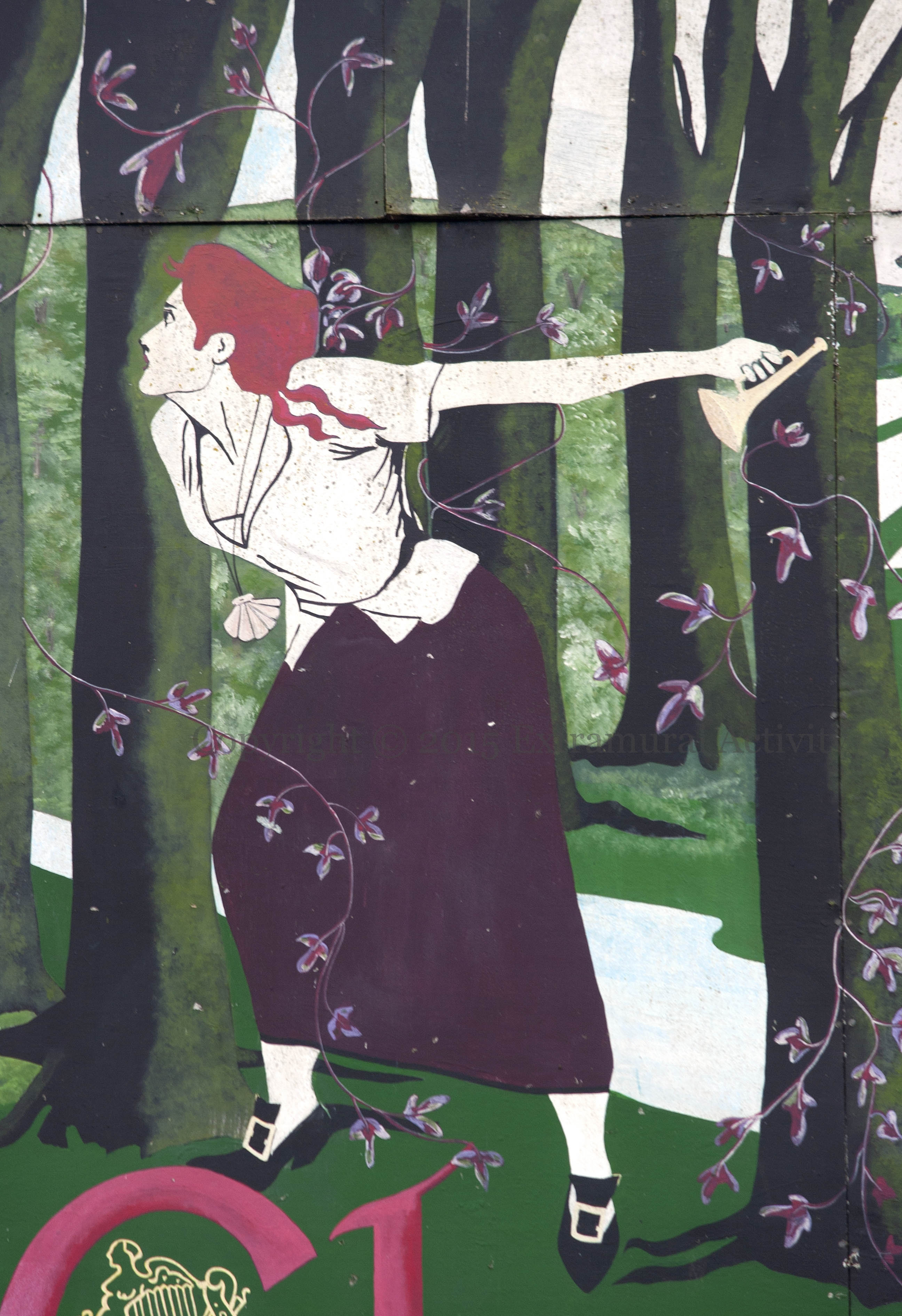 “Were you at the rock?” A red-headed lass (from an illustration in the Weekly Freeman of December 19th, 1891, commemorating 1798) with a horn stands watch for others at a mass rock – a stone in a remote location for Catholic worship, made necessary by a Penal law of 1695 which forbade the religious practice of Catholicism and “dissenter” forms of Protestantism (that is, anything other than Anglicism) (source). The harp, with a “cap of liberty” rather than a crown (WP), together the slogan “Equality – It is new strung and it shall be heard” is the emblem of the Society of United Irishmen (WP). On the other side of the mural (seen below) linen lies in the fields bleaching and a farmer and wife plough the land with a team of horses and distribute seed.