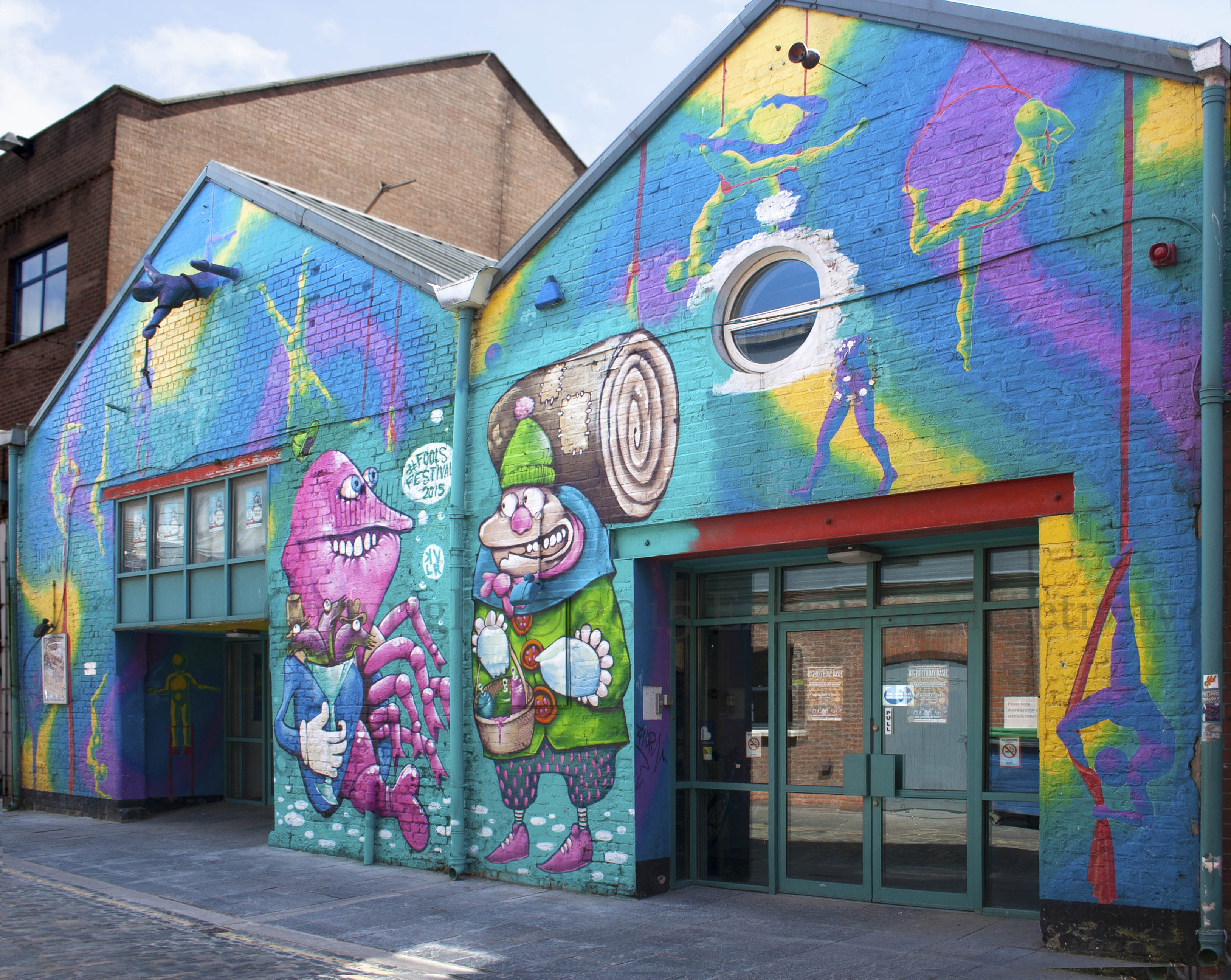 This Saturday and Sunday (June 20th and 21st), Belfast Community Circus celebrates its 30th birthday with two days of events and performances in the Cathedral Quarter, including a world record-breaking (hopefully) pie fight. Kev Largey (KVLR) last month placed two “foolish” figures among the acrobats on the front wall of the organization’s Gordon Street headquarters, a lobster having a drink of weasels wearing hats and a rambler with a patched bed-roll and basket of spray-cans. (Also seen in paste-up form outside the Sunflower – see Costume Party.)
