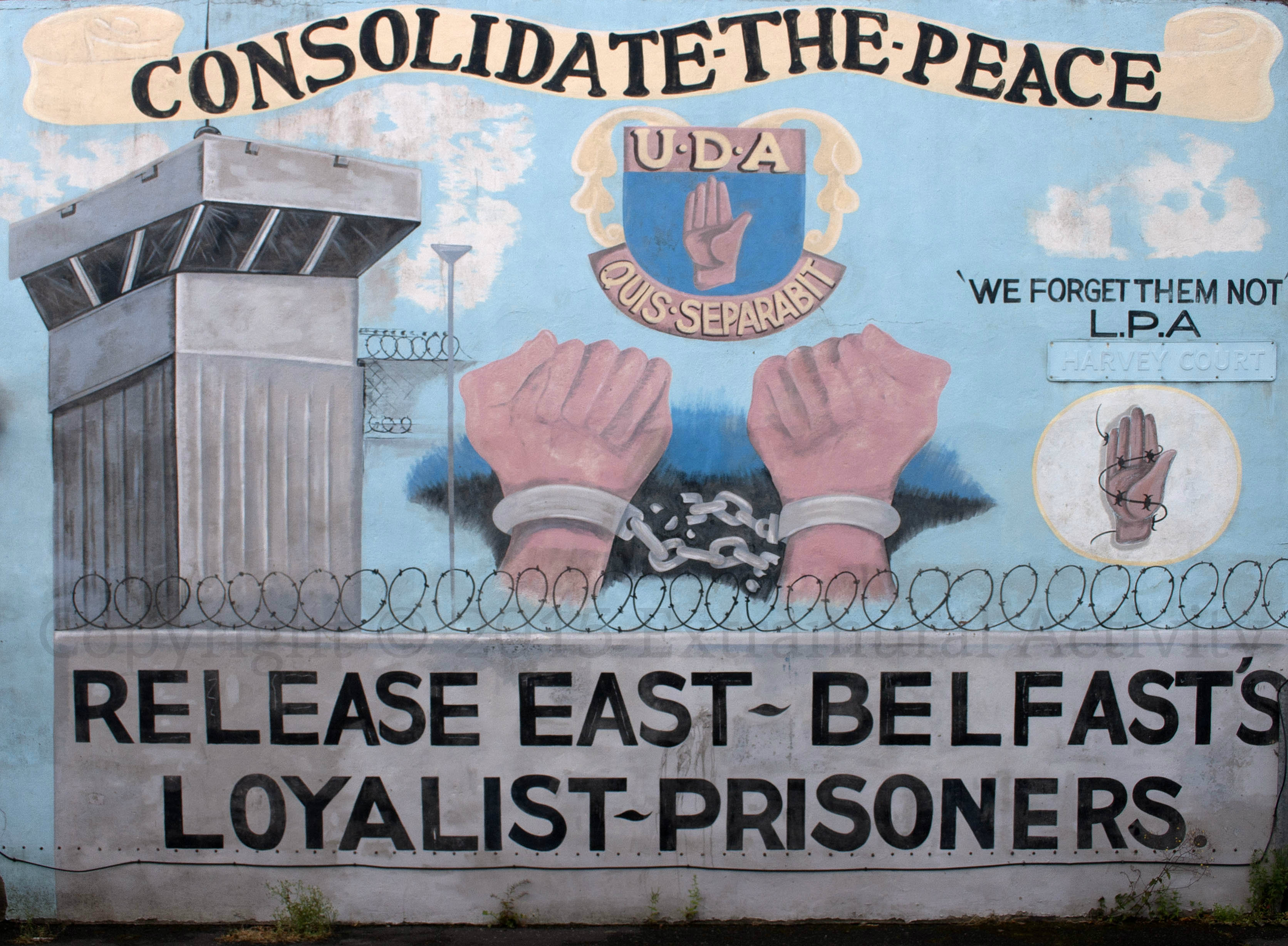 As talks were held at Stormont throughout 1997, (leading to the Good Friday (or: Belfast) Agreement in April 1998) paramilitaries on both sides in the conflict began pressing their case for concessions, including the release of political prisoners. The image above is of a 1997 UDA mural that is still in decent condition in loyalist east Belfast: Consolidate The Peace – Release East Belfast’s Loyalist Prisoners. It shows a Long Kesh tower and barbed wire with red hands breaking the chains between handcuffs. For a similar image (which was painted out this week) in nearby Lord St, see All Gave Some.