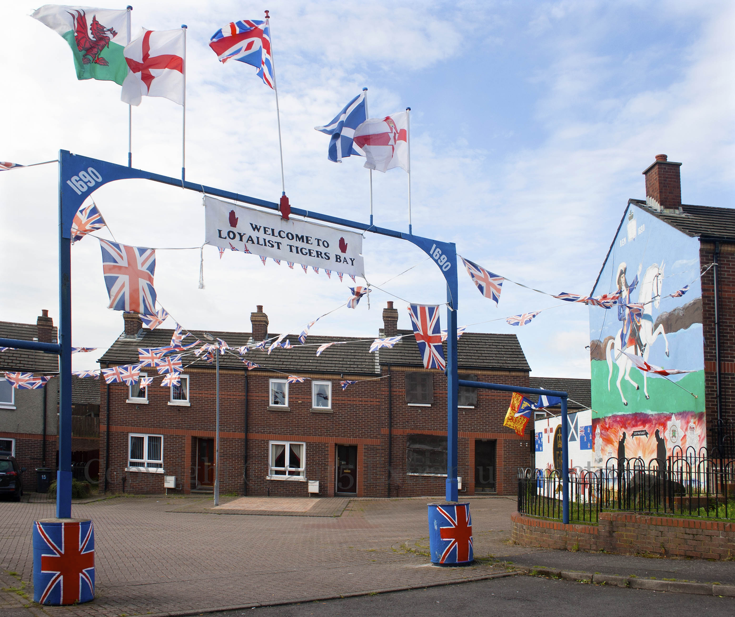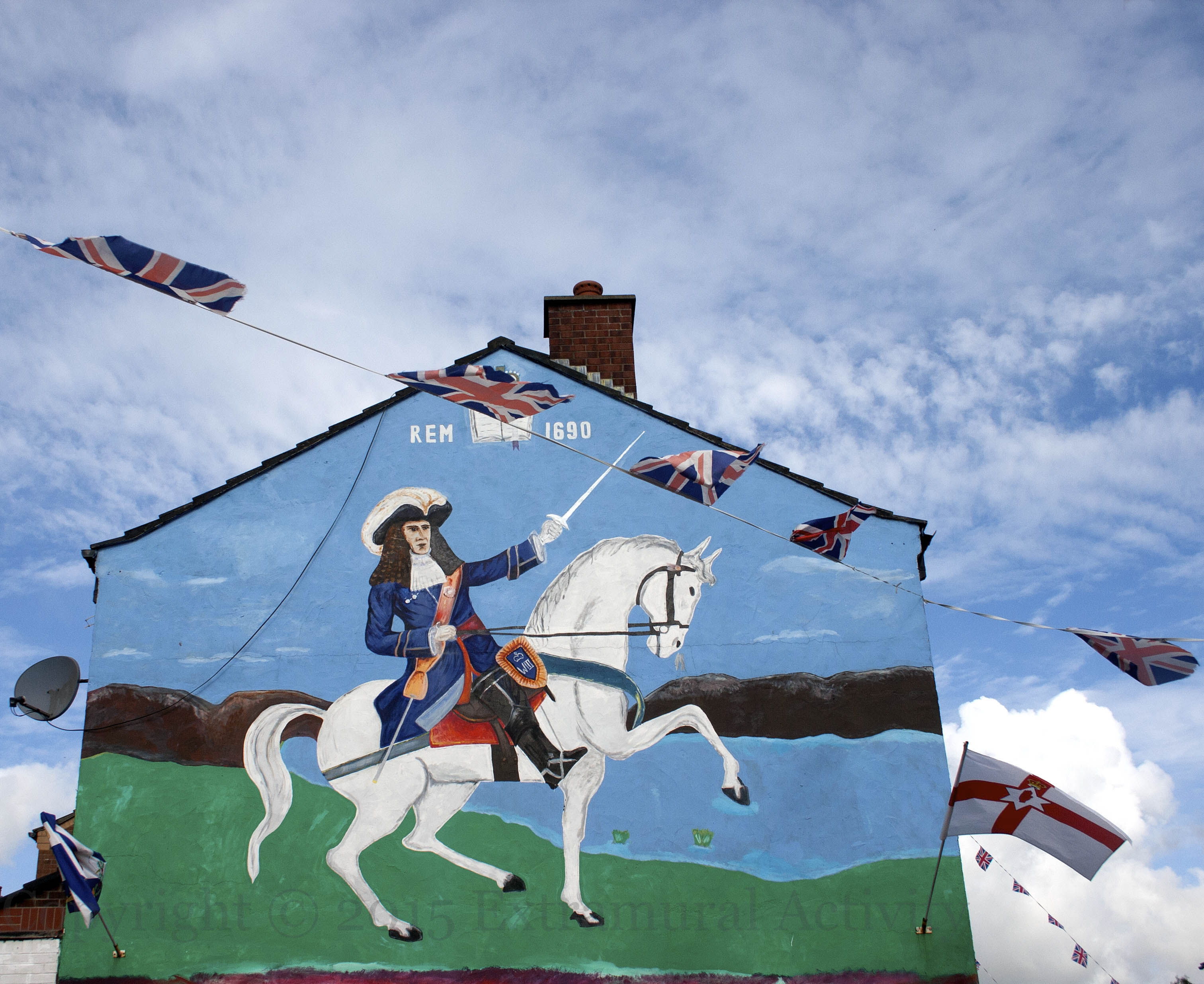 This fine example of King William III at the Battle of the Boyne completes the Tiger’s Bay trio of murals from the past two days (see You Will Become A Great Nation, Even Many Nations & North Of Ireland Armies). Shots of the three together and of the general scene are included below.