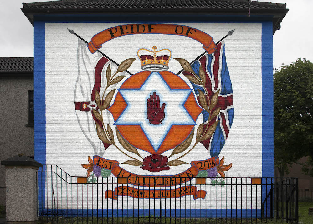 The Pride Of Ballybeen is a recently-formed flute band and they now have a band mural. It features the Union Flag and Ulster Banner flanking the red hand of Ulster on a six-pointed star against an orange field, surrounded by a crown and a garland pinned by a rose; the titular banner, below, is supported by shamrock and thistle.