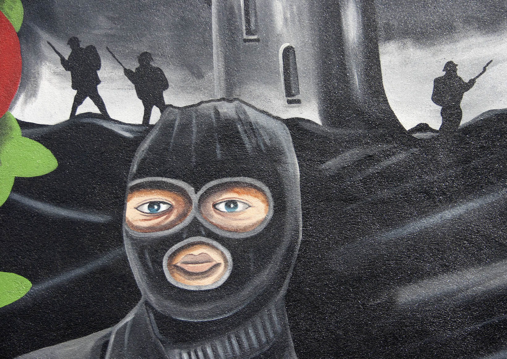 “For he today that sheds his blood with me shall be my brother. We few, we happy few, we band of brothers.” This is a new (July 2014) Red Hand Commando mural in Bangor with RHC Youth and Red Hand Comrades Association insignia against a backdrop of Thiepval Tower and the Somme, with masked gunmen in the foreground and a border of poppies.