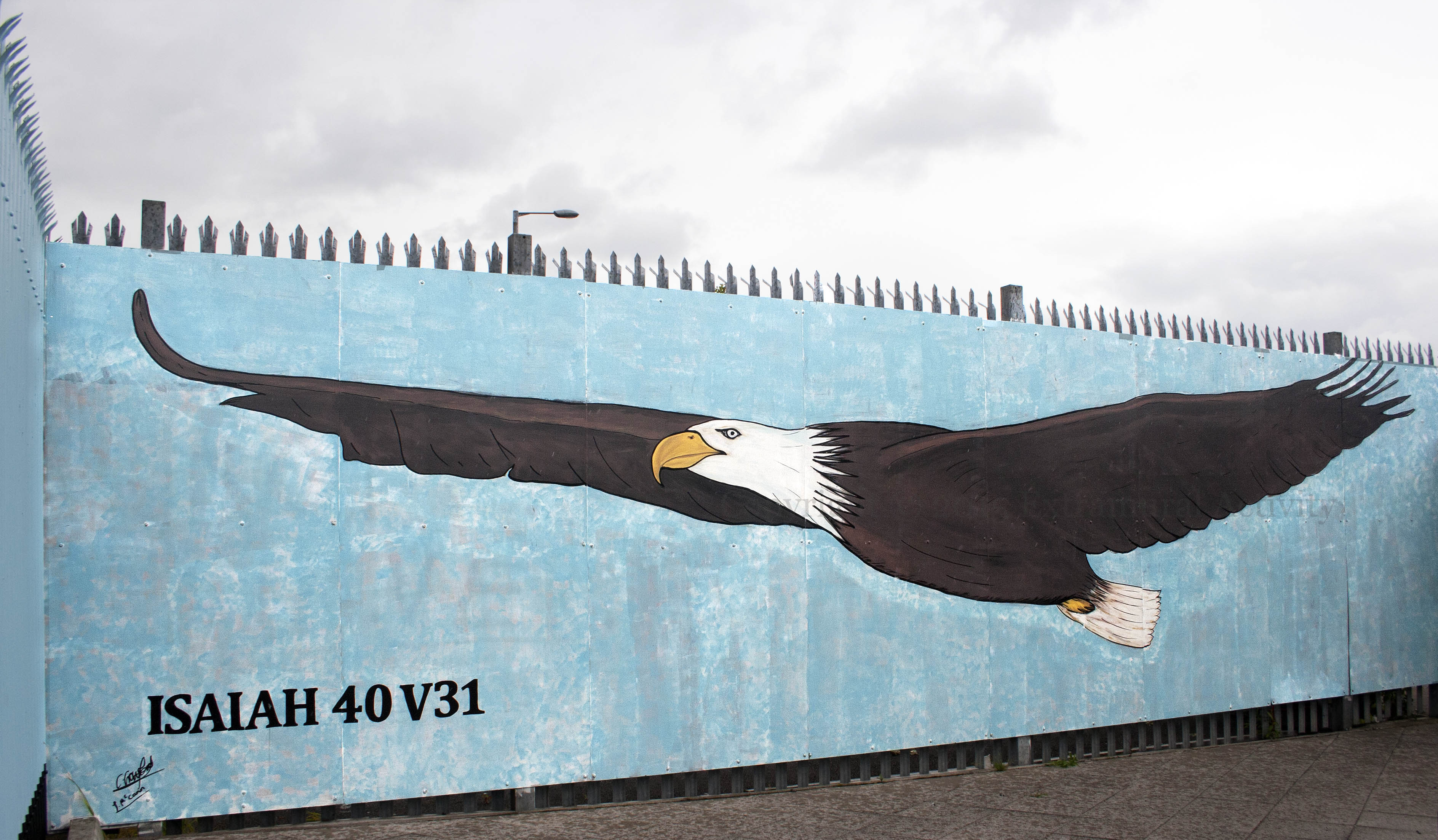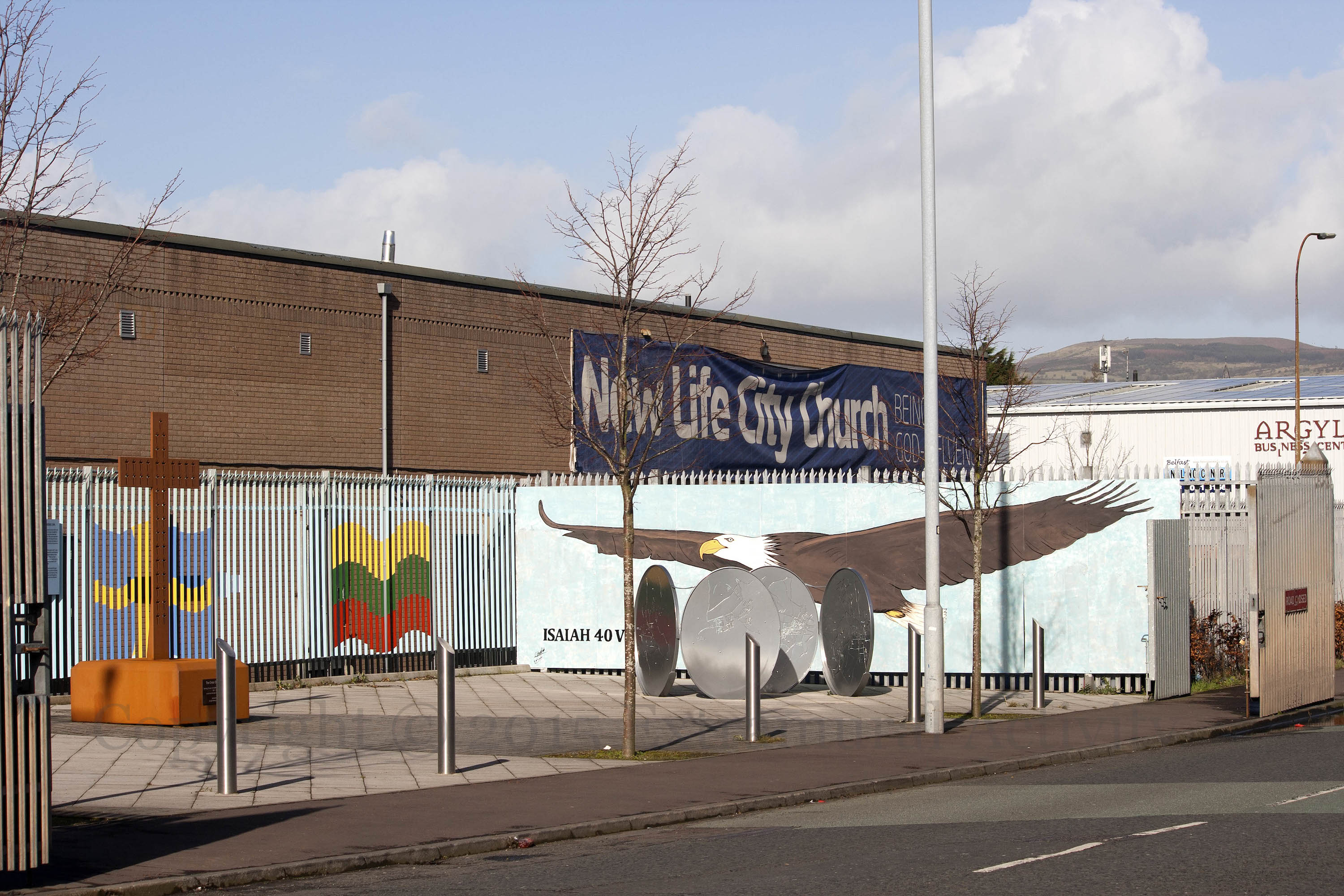 The eagle of Isaiah 40:31 flies outside the New Life church in the no-man’s land between the security gates on Northumberland Street: “Those who hope in the Lord will renew their strength. They will soar on wings like eagles; they will run and not grow weary, they will walk and not be faint.” (BibleHub)