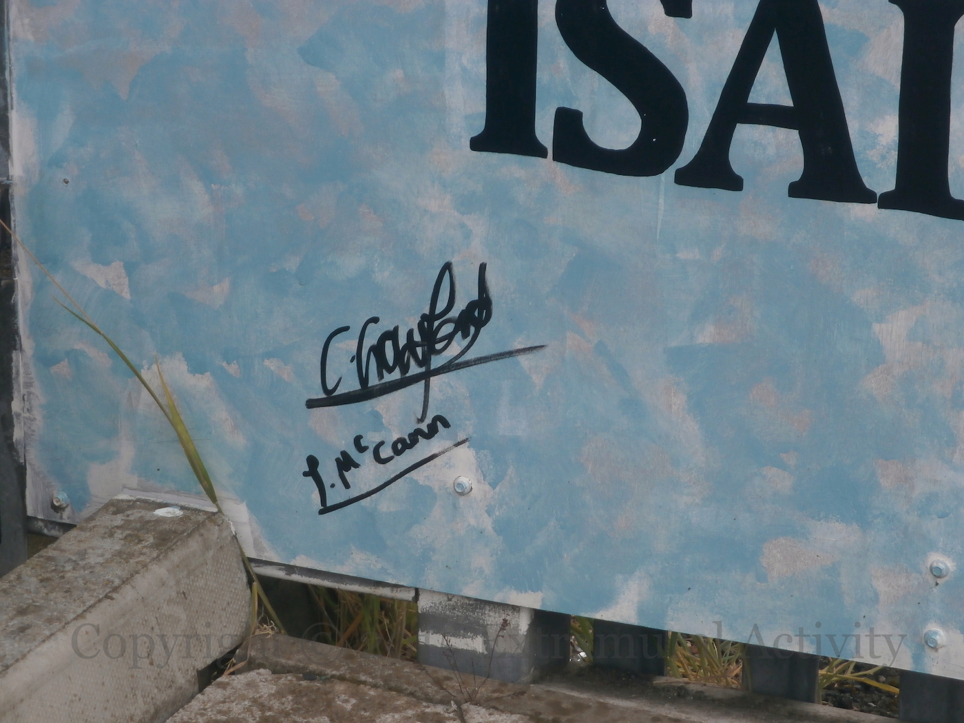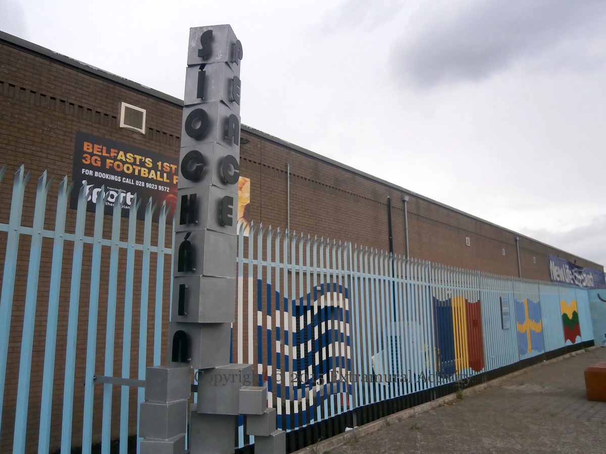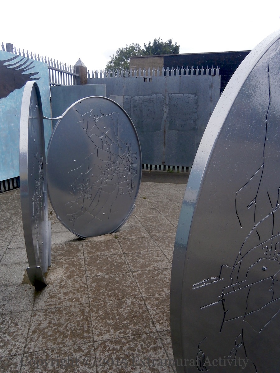 The signature and the giant “coins” in front of it are shown below, along with the Síocháın/Peace tower. The (brown) cross in the middle of the area is shown in Cross Of Crosses.