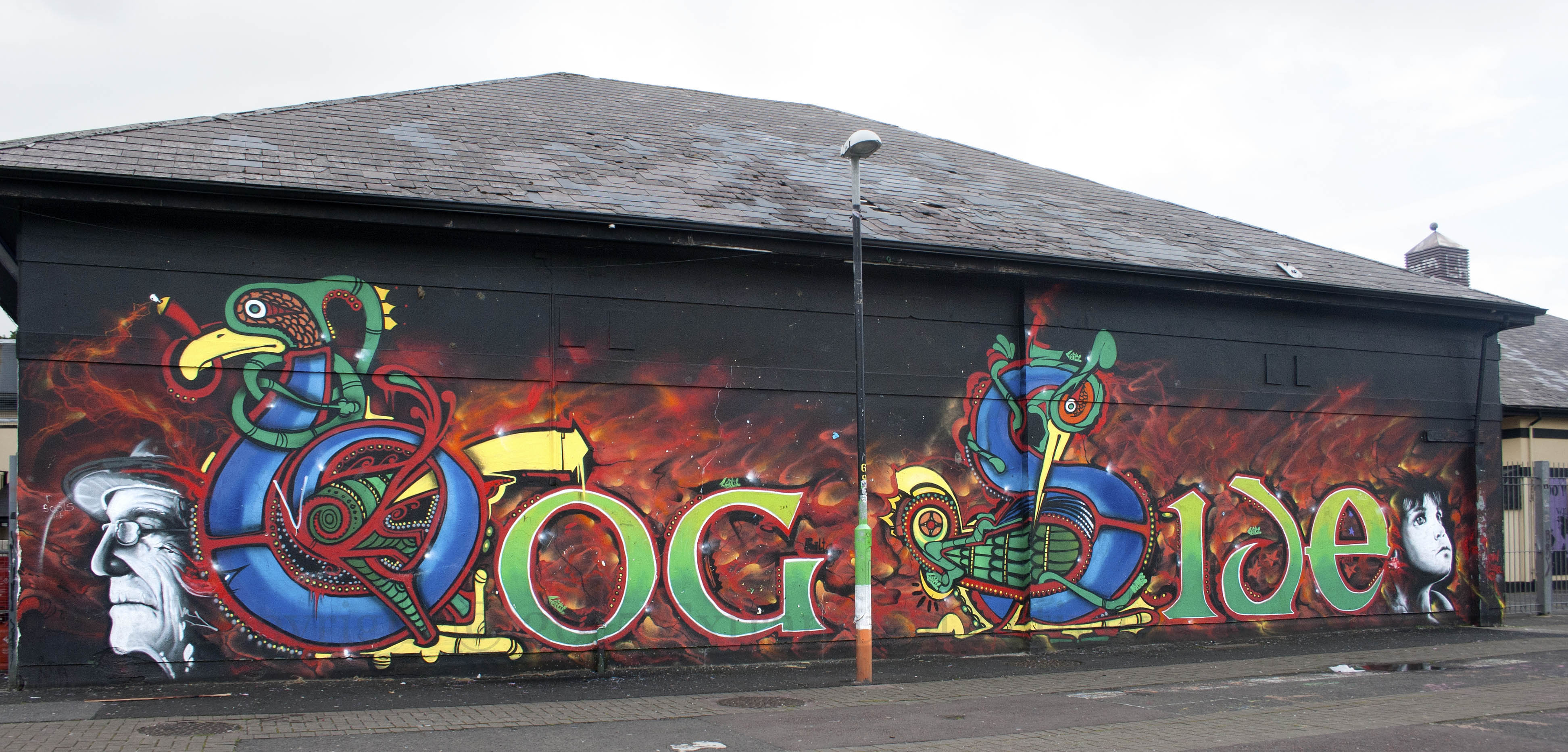 The eastern side of what was the island of Derry is called the Water side and the western side, although originally under water, became the Bog side in about 1600. The two murals shown here are on either side of the shops adjacent to the Bogside Inn. There is an excellent history of the area from 1162 to the construction of Rossville flats in 1966 at the Museum Of Free Derry.