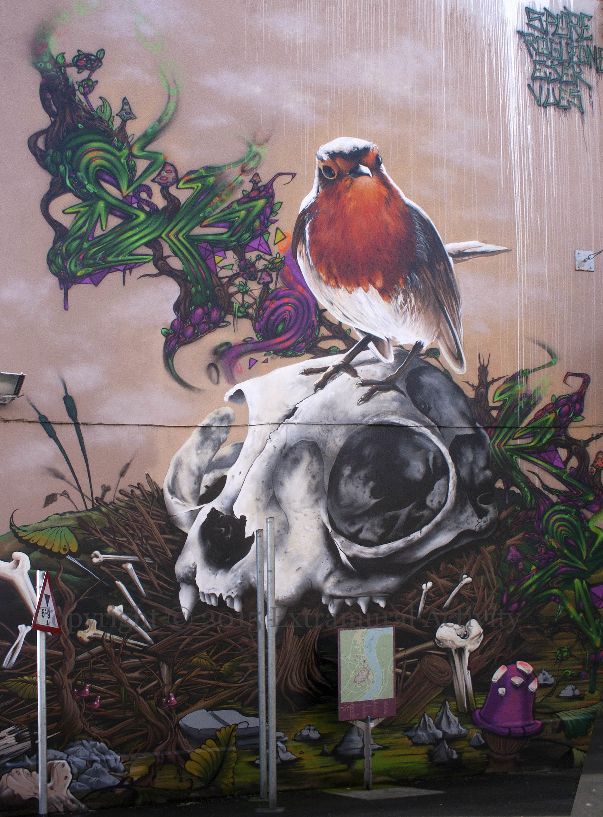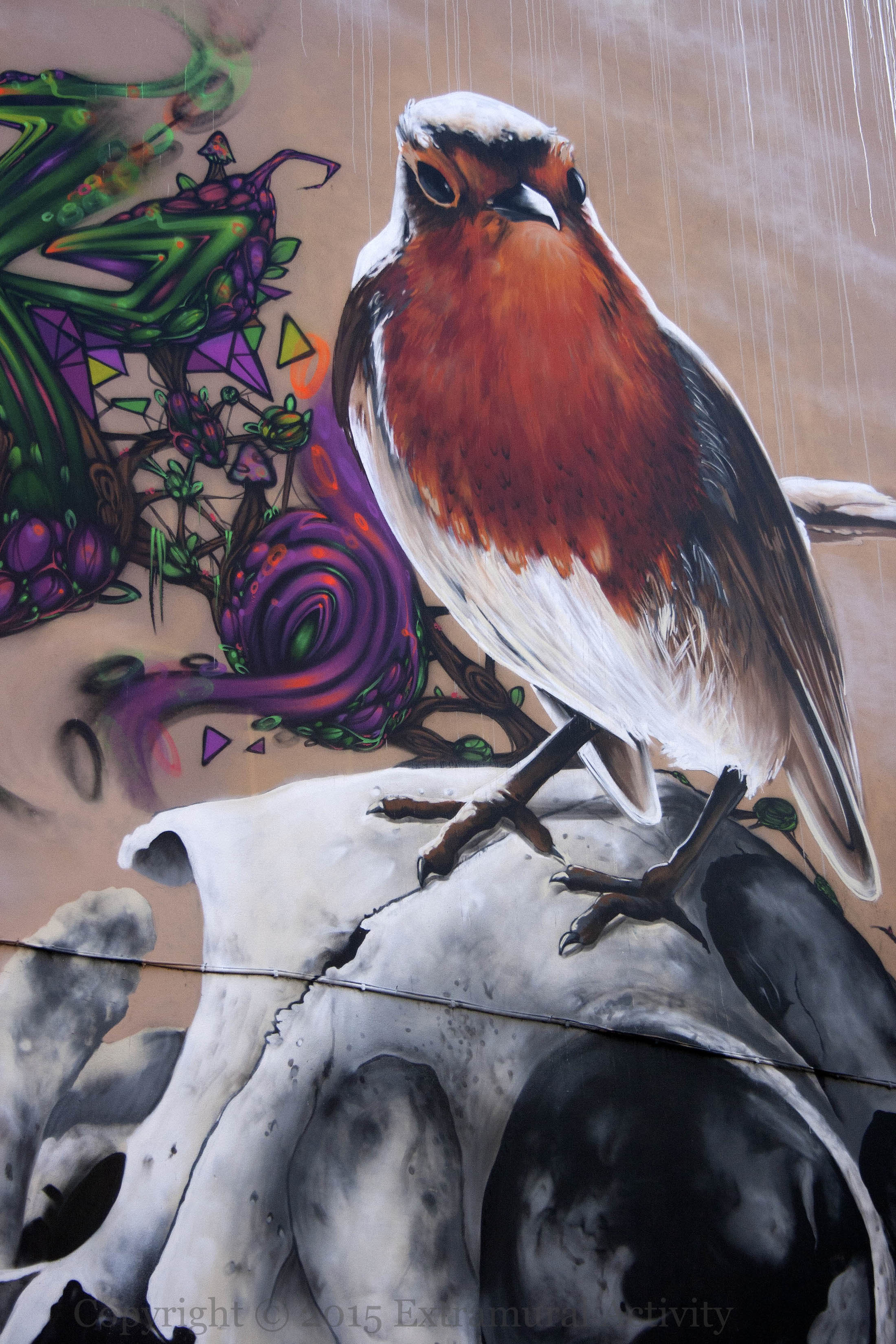 A robin sits atop the skull of a cat. Work by Glaswegian street artists Spore, Ejek, Rogue-One, and Vues Oner for the Release The Pressure festival in London/-Derry/Doire back on July 25-26th. See below for a shot of the whole thing and a video of the piece in production.