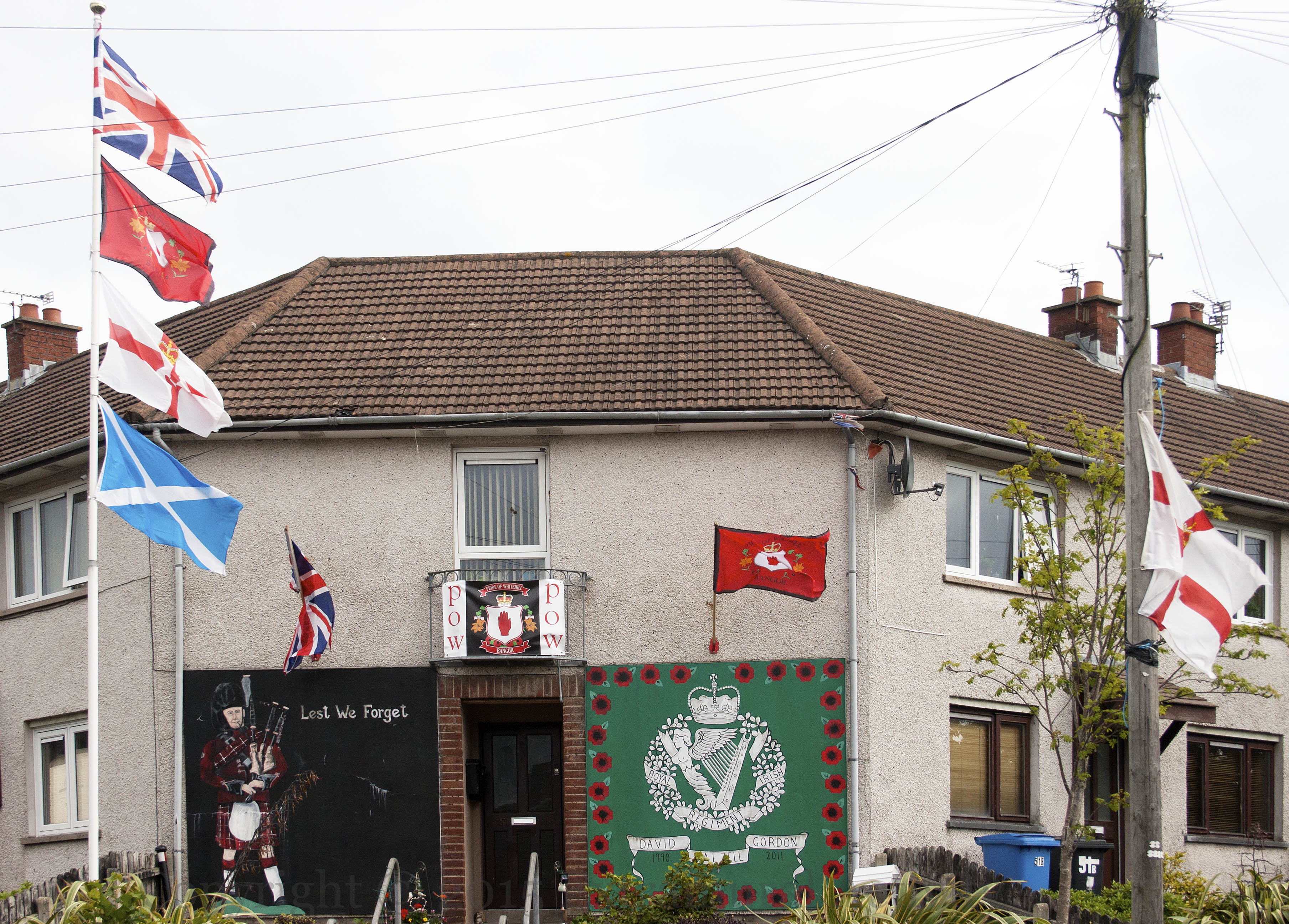Bangor native David Gordon Dalzell was killed at age 20 in Helmland Province, Afghanistan, in 2011, shot accidentally by one of his comrades as he was cleaning his weapon. For an account of his death, see BBC-NI. Dalzell’s ‘fatality’ notice can be read at the MOD. In the image above (and detailed below), the front of this Whitehill house carries the emblem of Dalzell’s Royal Irish regiment and a funeral piper.