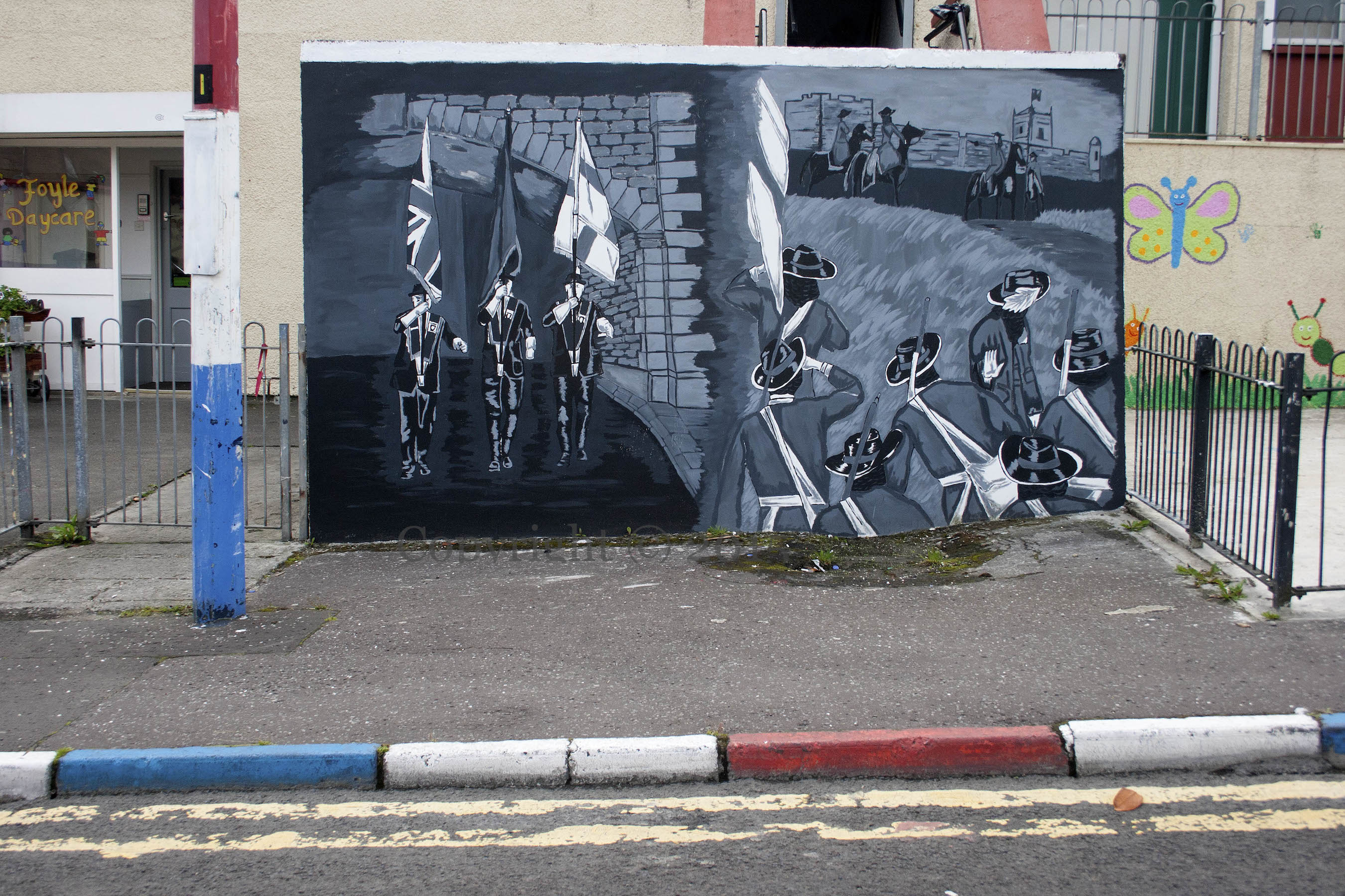 The “Little Blooms” receive a lecture in history and politics each day as they mount the painted kerb-stones and take in a mural of Orange Order flag-bearers and a scene from the Siege of Derry, perhaps of James II demanding the city and being rebuffed with cries of “No surrender”.