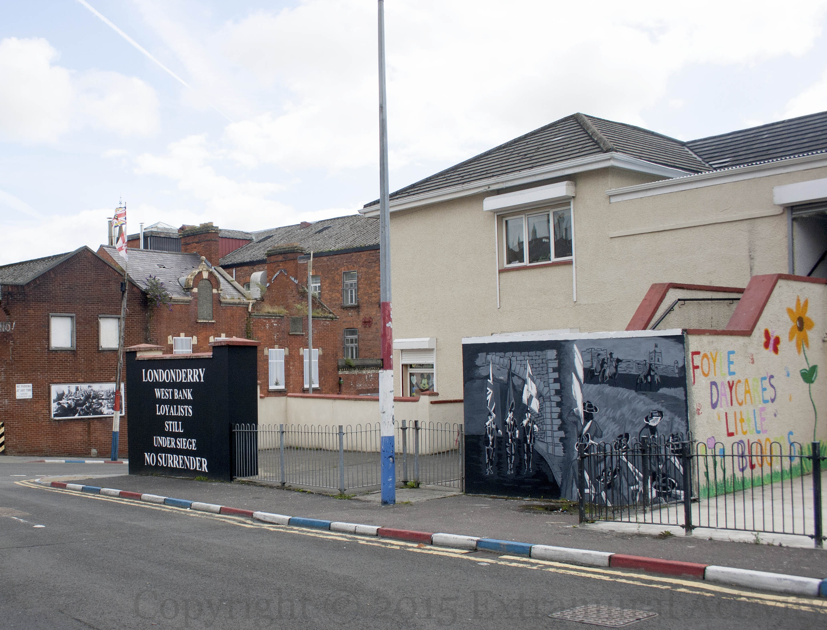 X02825 X02824 X02826 painted 2015-06 walls gate Londonderry siege william union jack ulster banner bishop’s gate 18 april 1869 west bank loyalists still under siege