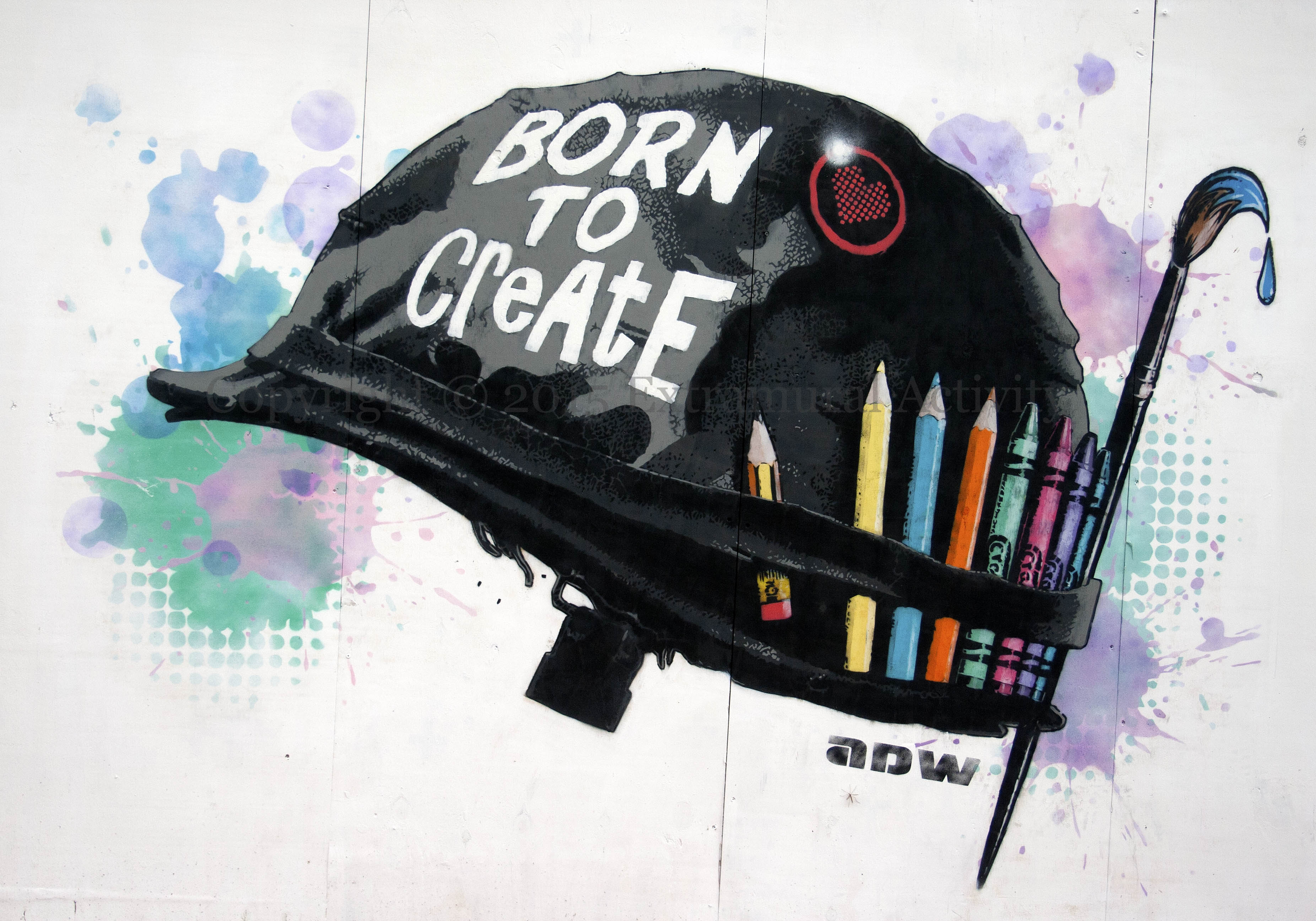 ADW‘s (Fb) CNB15 ‘combat helmet of crayons’ piece in Garfield Street has already been reclaimed by the Belfast graffitists (specifically NOTA), cheekily turning ‘born to create’ into ‘born 2 destroy’, rather like the ‘born to kill’ from the poster for Stanley Kubrick’s Full Metal Jacket, on which the work was based (final image, below).
