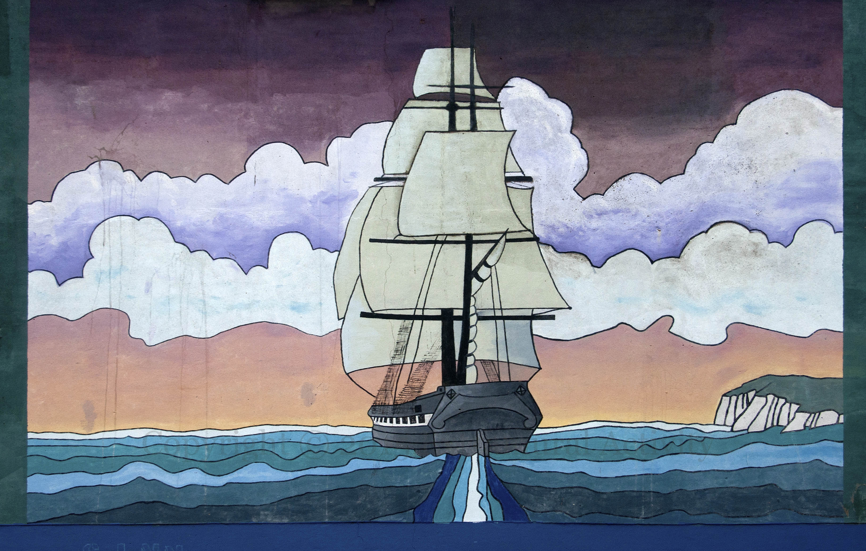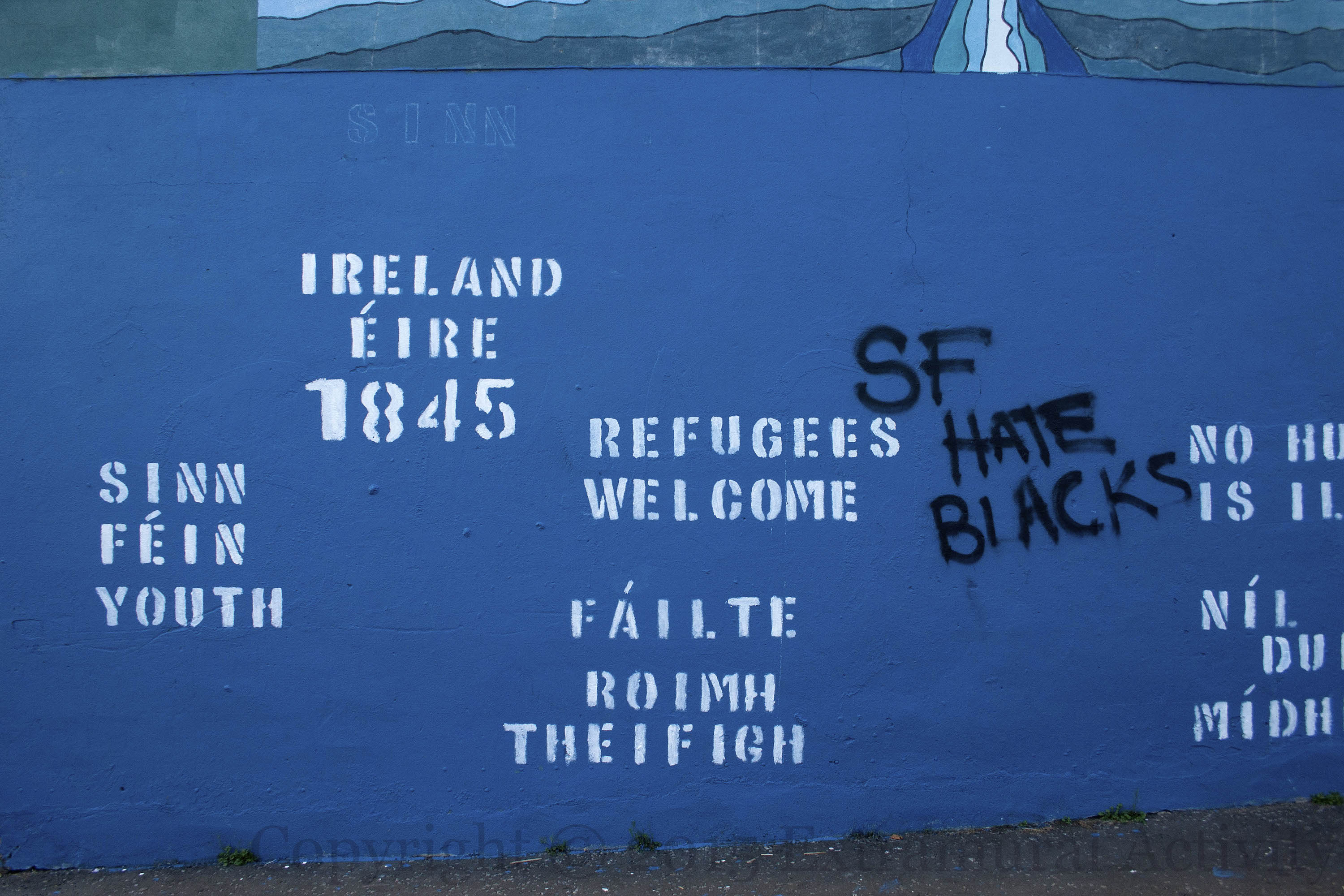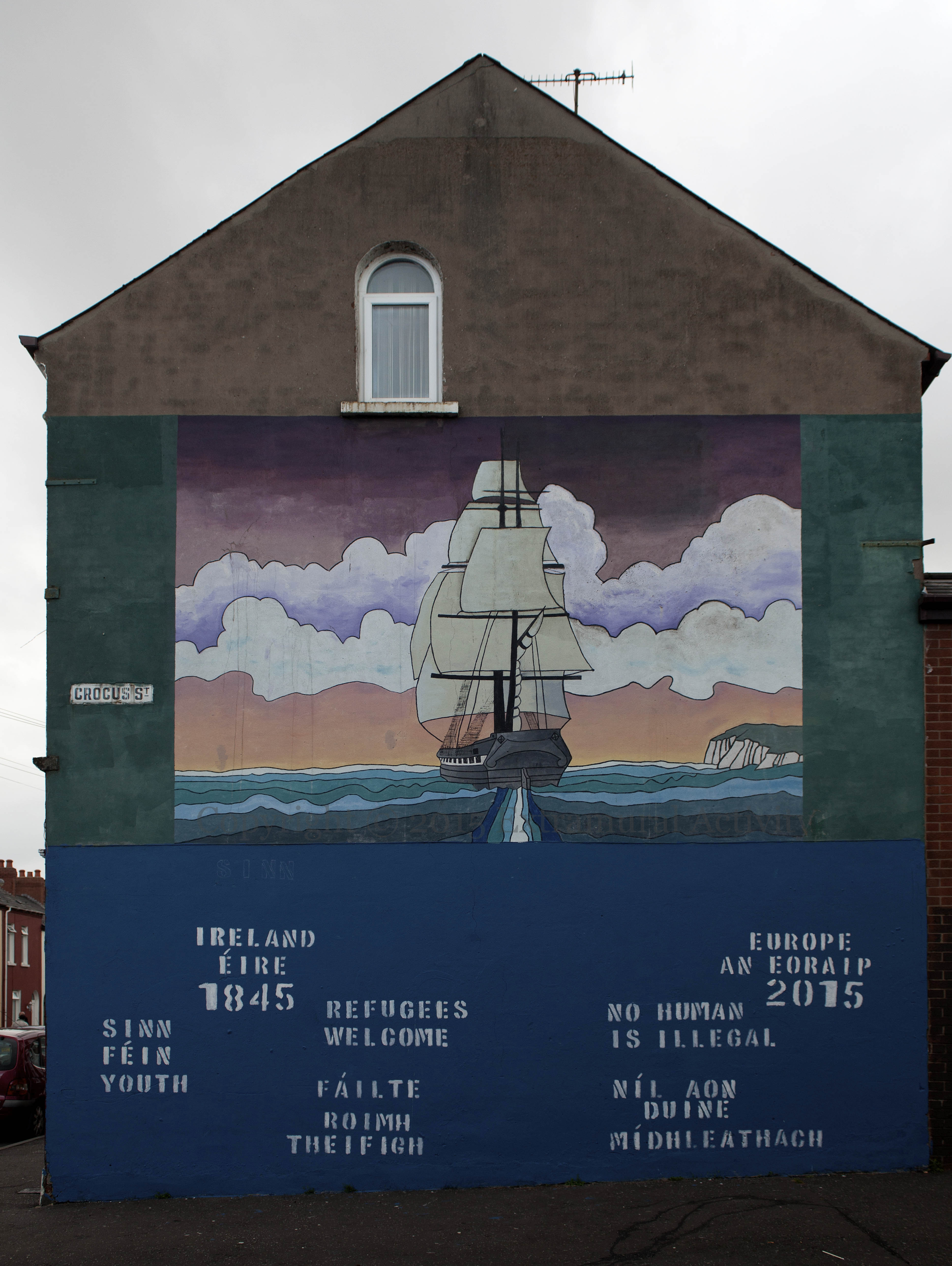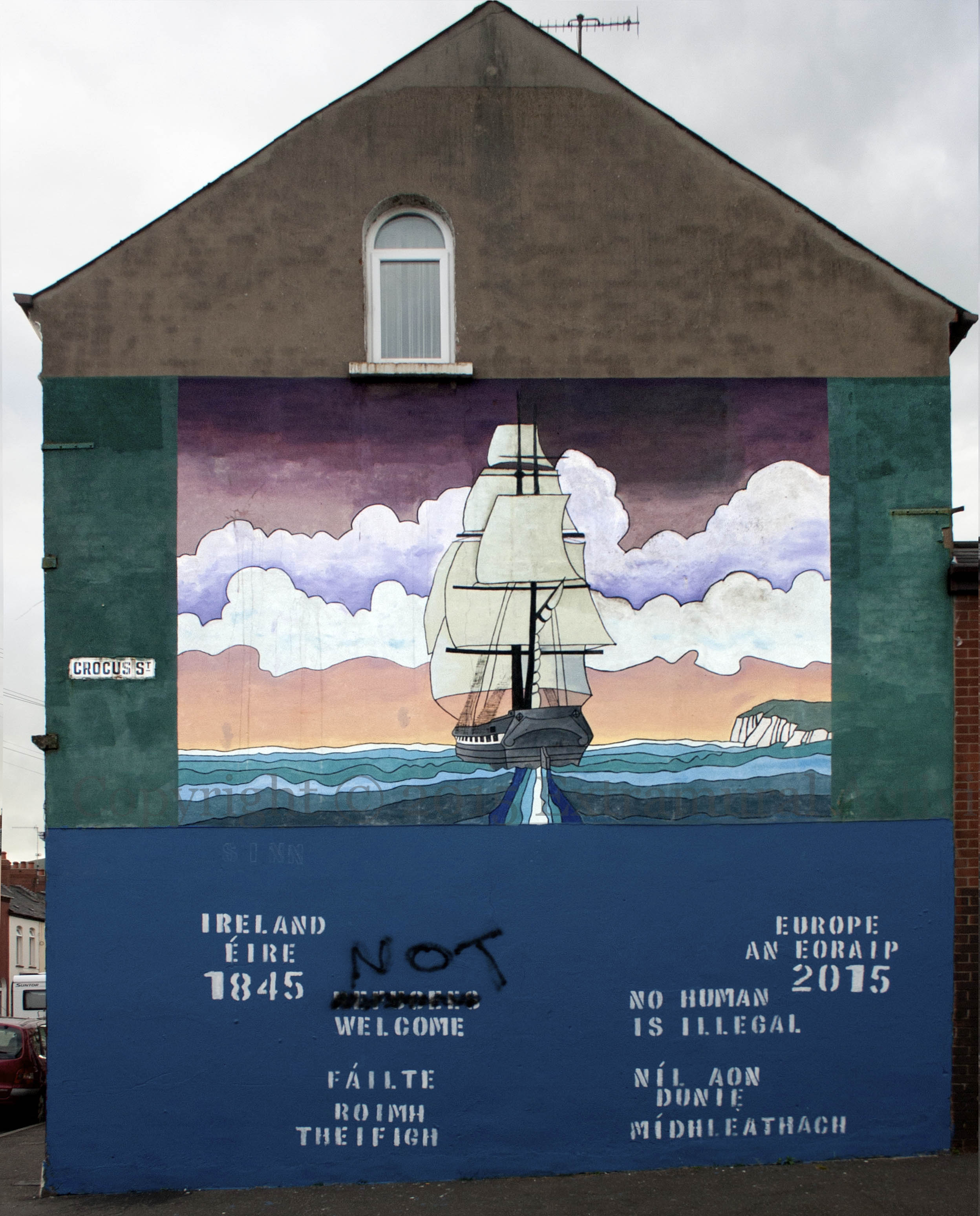 Incidents involving ships of African emigrants seeking refuge in Europe are so many that there is a separate Wikipedia page for them. In response to the crisis, an old mural in Crocus Street (see M01486) remembering the emigration of Irish to North America during the Great Hunger was repainted and the lower part (which had images of the Great Hunger) replaced by stencilling which makes reference to the 2015 situation: “Ireland/Éıre 1845 – Europe/An Eoraıp 2015”, “Refugees welcome – Fáılte roımh theıfıgh”, and “No human is illegal – Níl aon dunıe [duıne] mídhleathach”. It was immediately vandalized with a “not” (see the final image, below; Fb) but has now been repaired, along with the mis-spelling.