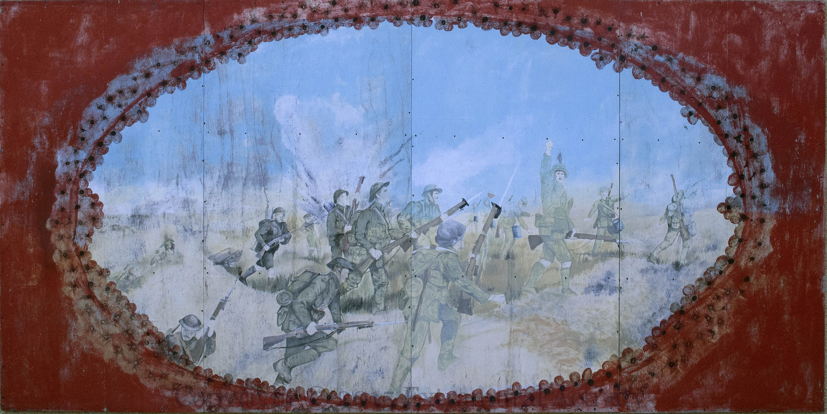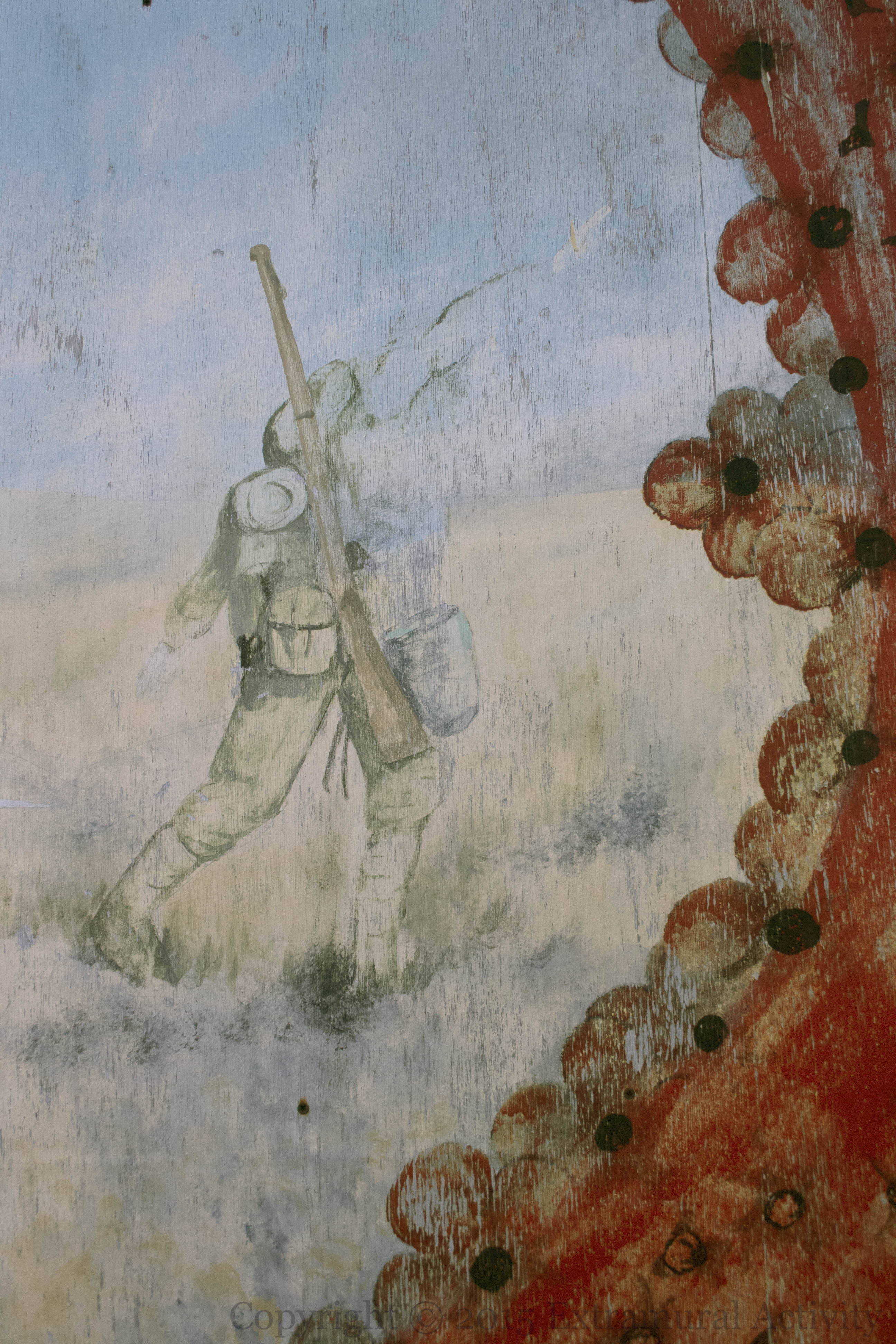 This WWI mural is fading somewhat after at least eight years on a wall in Strule Gardens, Londonderry. It shows soldiers going over the top, as depicted in JP Beadle’s Attack Of The Ulster Division (belfastsomme.com).