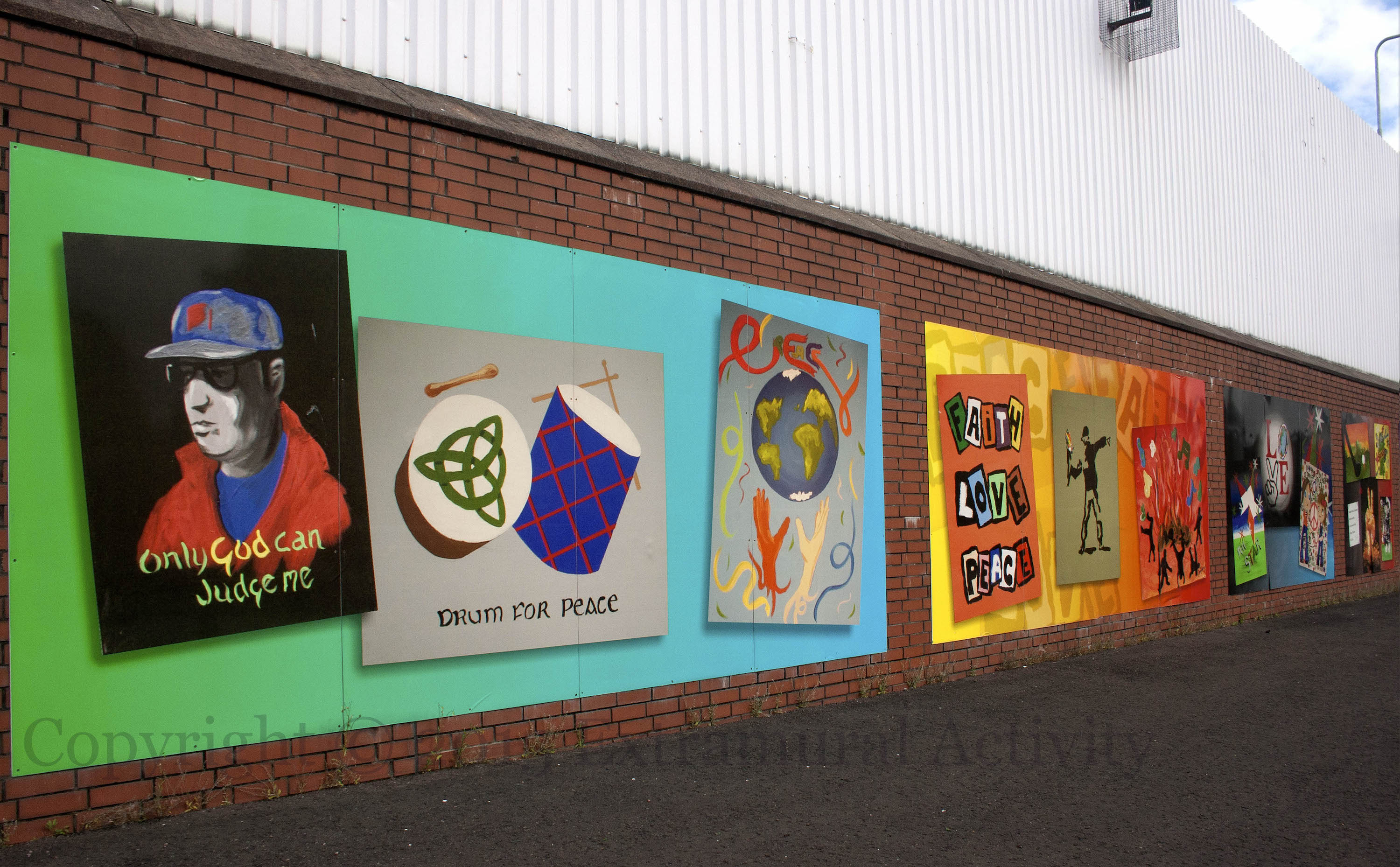 X02983 X02982 drum for peace faith love peace 2Pac all eyez on me earth world love robert indiana police service northern ireland woodbourne stewartstown rage the flower thrower chucker banksy