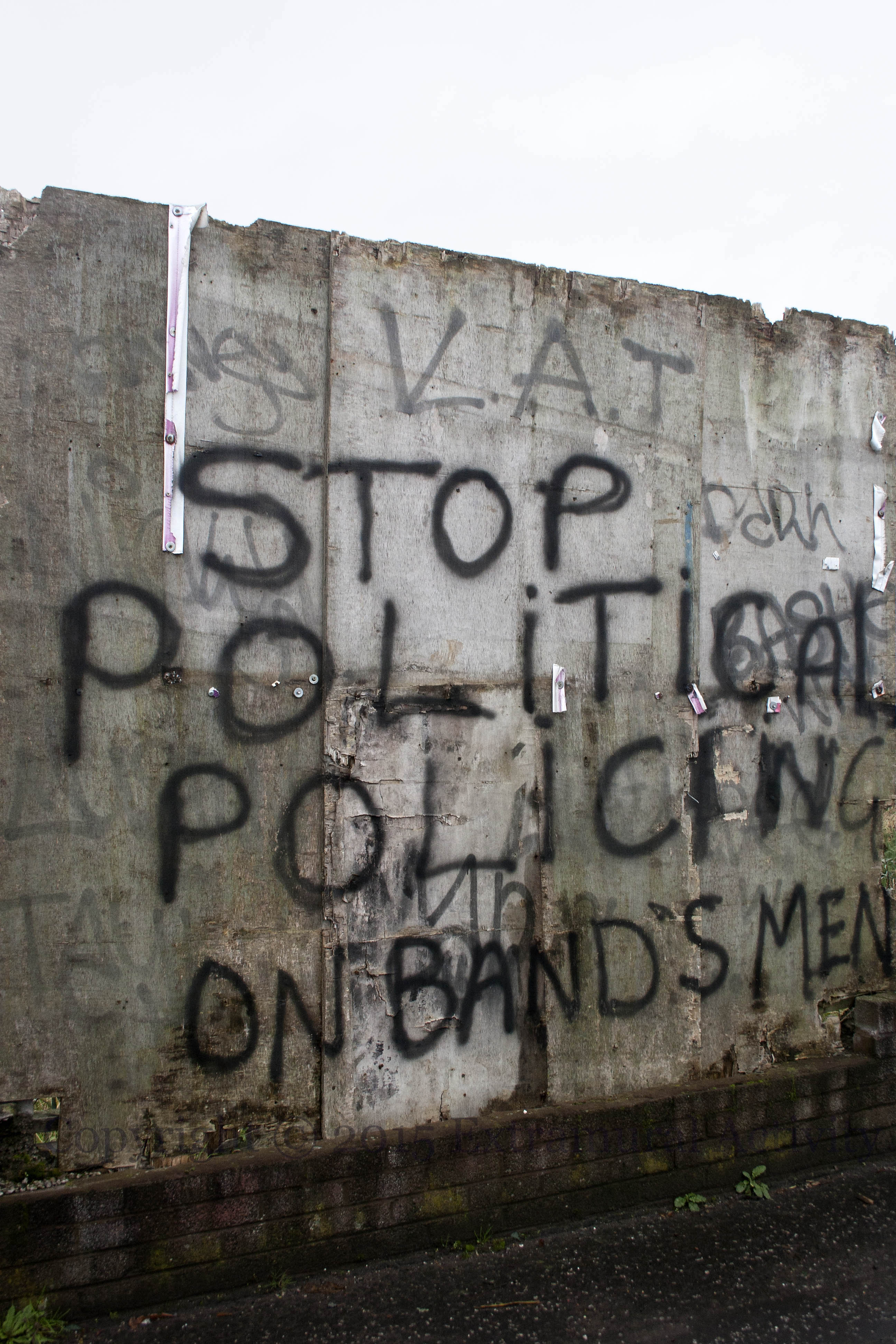 Here are two images related (perhaps indirectly) to the prosecution of members of the Young Conway flute band for playing The Famine Song/The John B. Sails (WP) outside St. Patrick’s church in Donegall Street during the parade season in the summer of 2012. On Tuesday (December 1st), the thirteen band members had their April convictions quashed. (Telegraph) Above is graffiti on Lanark Way — Stop political policing on band’s men — and below a flyer for a fundraiser in support of the legal appeal.