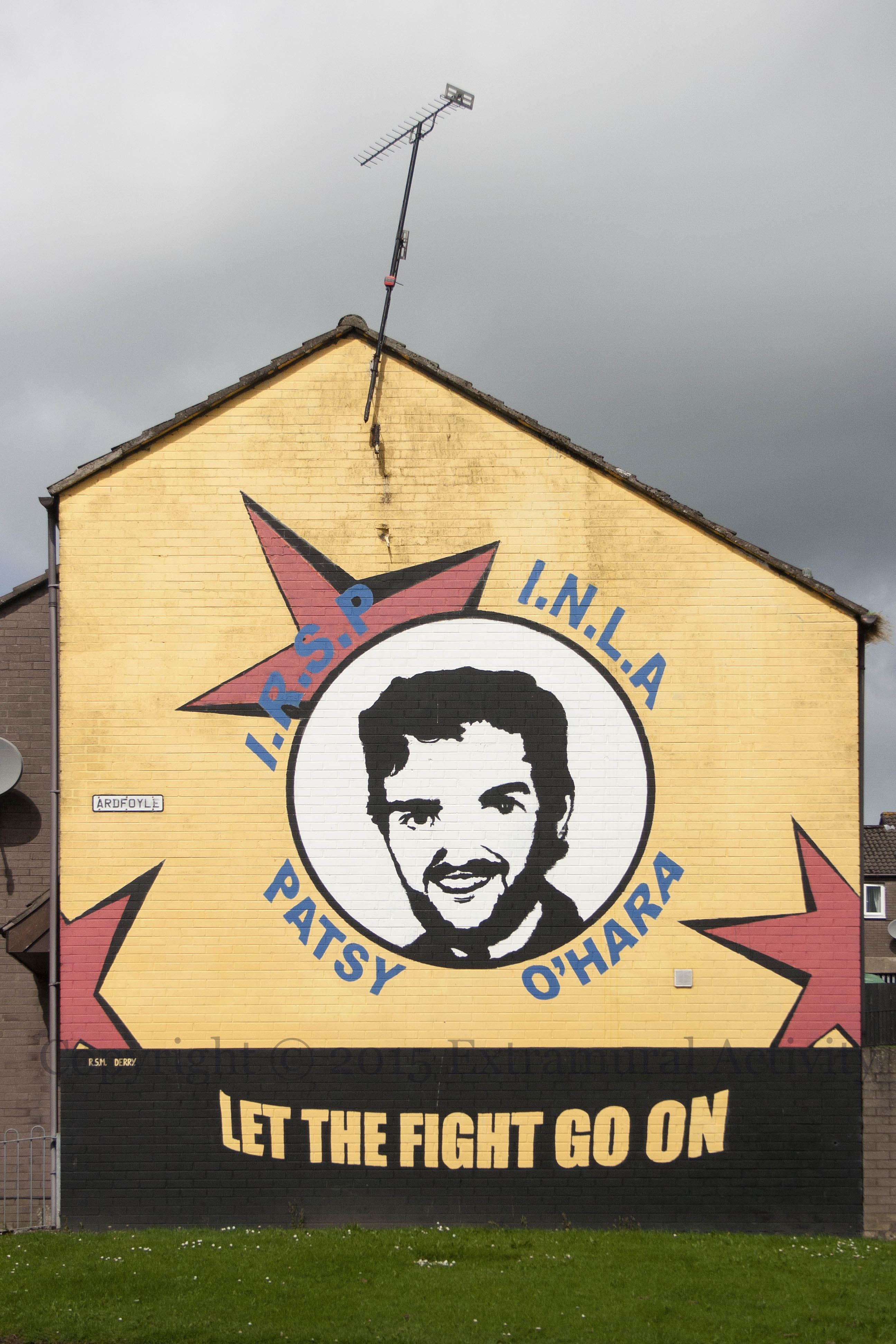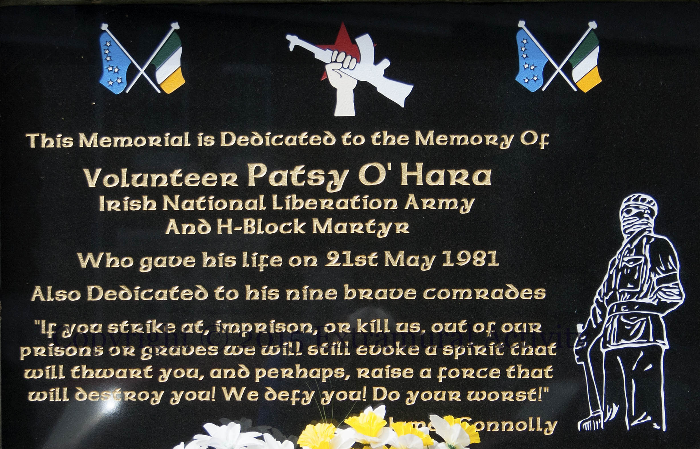Patsy O’Hara mural and (out of shot to the left but shown in close-up below) memorial stone: This memorial is dedicated to the memory of Volunteer Patsy O’Hara, Irish National Liberation Army and H-Block martyr, who gave his life on 21st May 1981. Also dedicated to his nine brave comrades. “If you strike at, imprison, or kill us, out of our prisons or graves we will still evoke a spirit that will thwart you, and perhaps, raise a force that will destroy you! We defy you! Do your worst!” – James Connolly