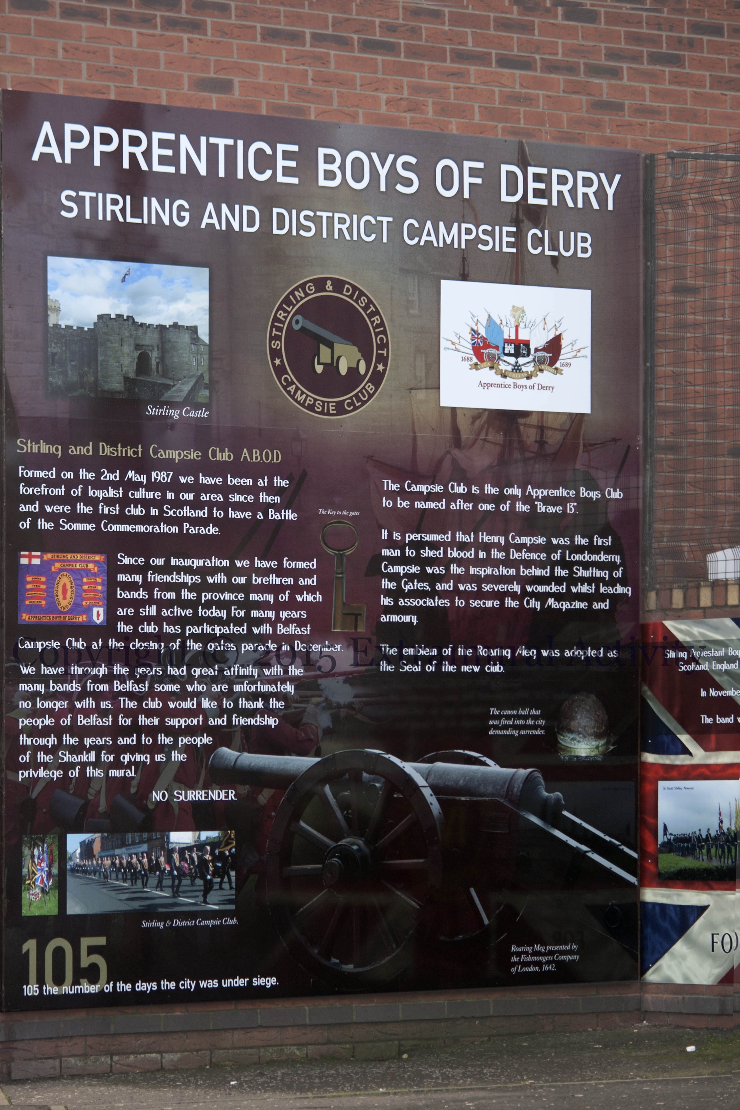 “Formed on the 2nd May 1987 we have been at the forefront of loyalist culture in our area since then and were the first club in Scotland to have a Battle of the Somme Commemoration Parade. Since our inauguration we have formed many friendships with our brethren and bands from the province many of which are still active today. For many years the club has participated with Belfast Campsie Club at the closing of the gates parade in December. We have through the years had great affinity with the many bands from Belfast some who are unfortunately no longer with us. The club would like to thank the people of Belfast for their support and friendship through the years and to the people of the Shankill for giving us the privilege of this murals.