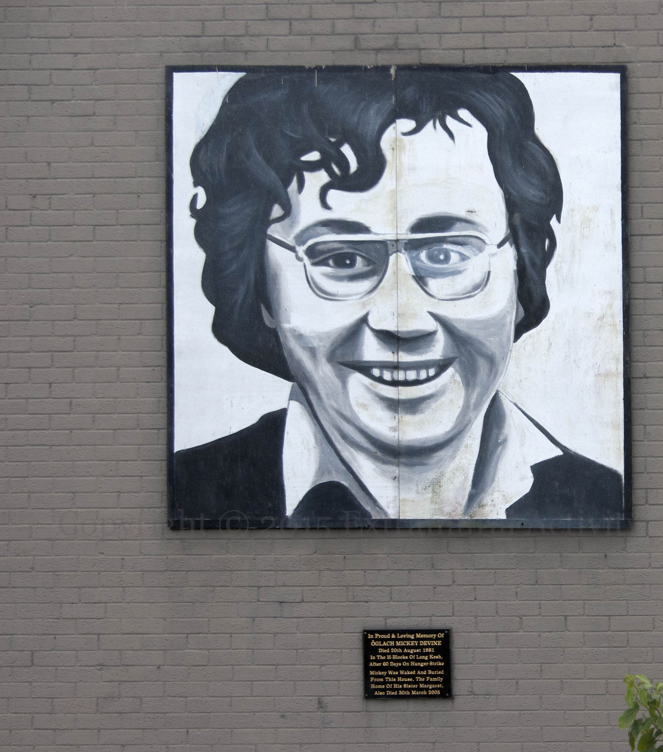 “In proud and loving memory of Óglach Mickey Devine. Died 20th August 1981 in the H-Blocks of Long Kesh after 60 days on hunger-strike. Mickey was waked and buried from this house [in Rathkeele Way, Derry], the family home of his sister Margaret. Also died 30th March 2005.” For an image of the open coffin within the house, see this An Phoblacht article. Here is a Guardian interview with Margaret (Devine) McCauley.