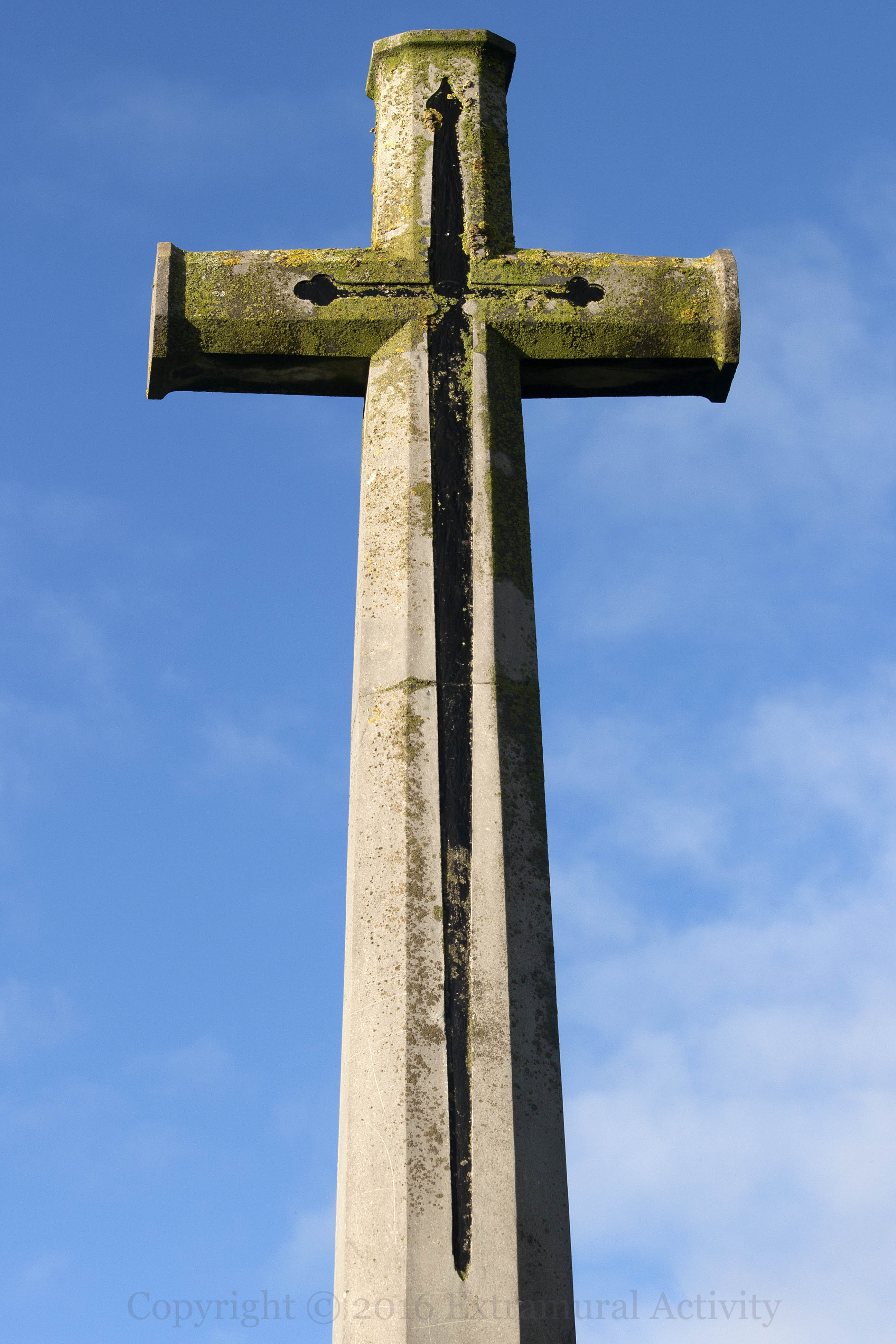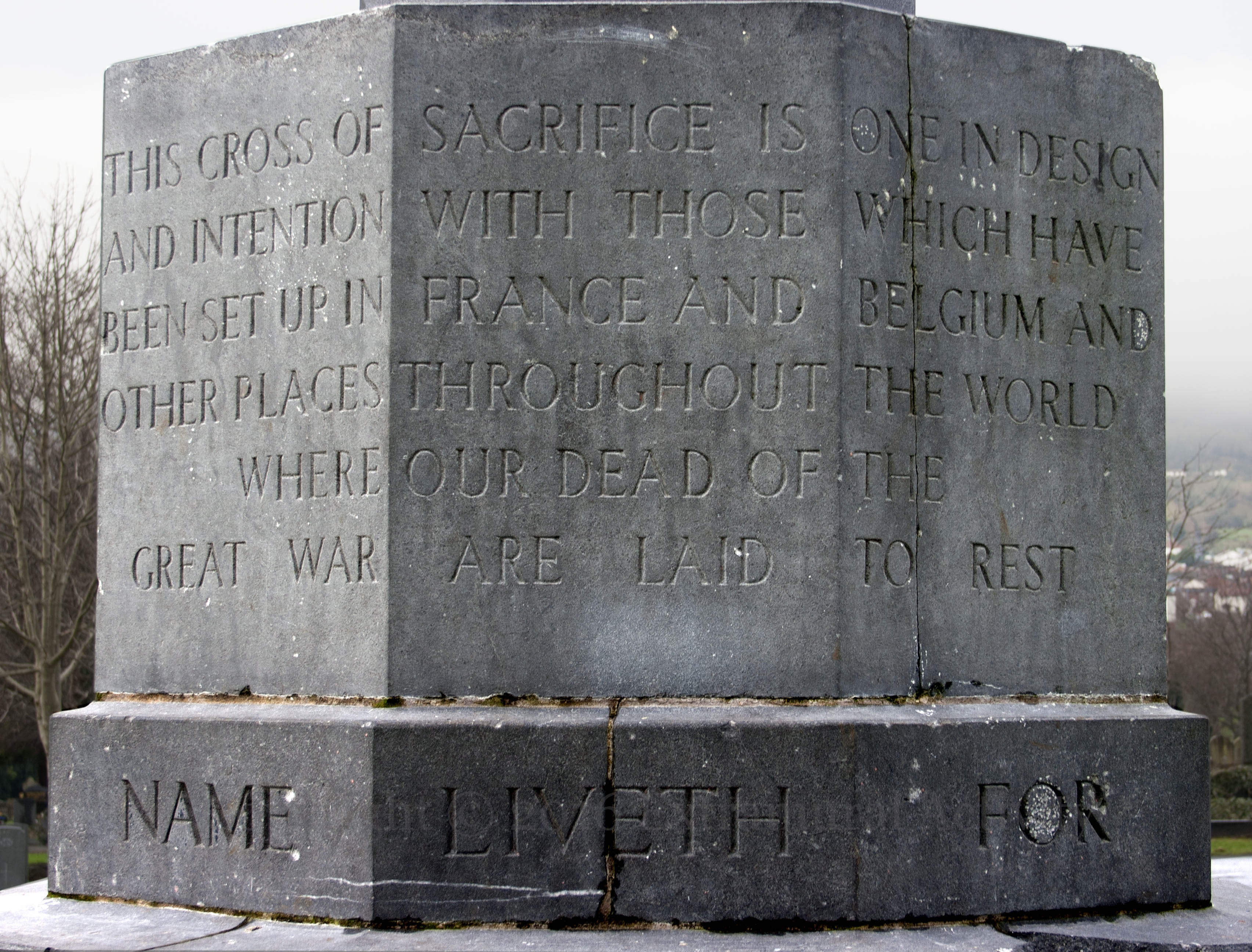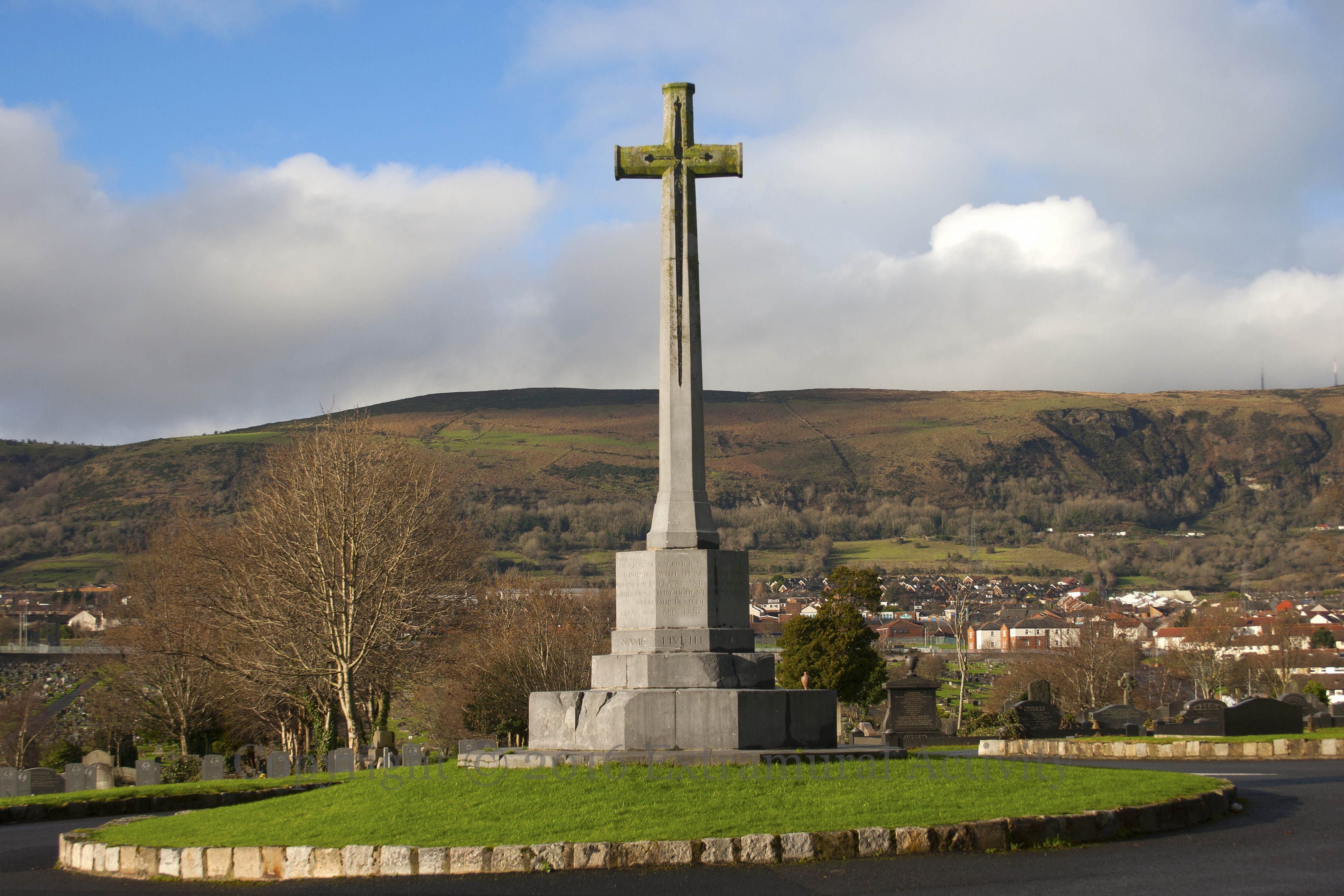 Religion and military might are one in this giant (see the wide shot, below) cross in Belfast’s City Cemetery, which commemorates the dead of World War I. The base (shown below) reads: The cross of sacrifice is one in design and intention with those which have been set up in France and Belgium and other places throughout the world where our dead of this great war are laid to rest. Their name liveth for ever more.” There is a similar memorial in Dundonald Cemetery. According to the Commonwealth War Graves Commission, “There are now 296 Commonwealth burials of the 1914-1918 war and 274 of the 1939-1945 war commemorated here.”