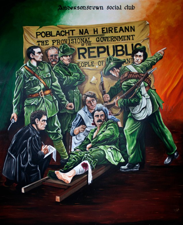 The ‘Revolution 1916’ exhibition – items from which were shown in Belfast earlier in February (see Revolution 1916) – opened in Dublin this weekend, including two murals (see this An Phoblacht article for one of them). The three painters also painted the mural above for the mini-exhibition in Andersonstown, reproducing the left-hand grouping from Walter Paget’s Birth Of The Irish Republic and putting the proclamation in the background. For Paget’s original oil painting and other version of it, see the painting’s Visual History page.