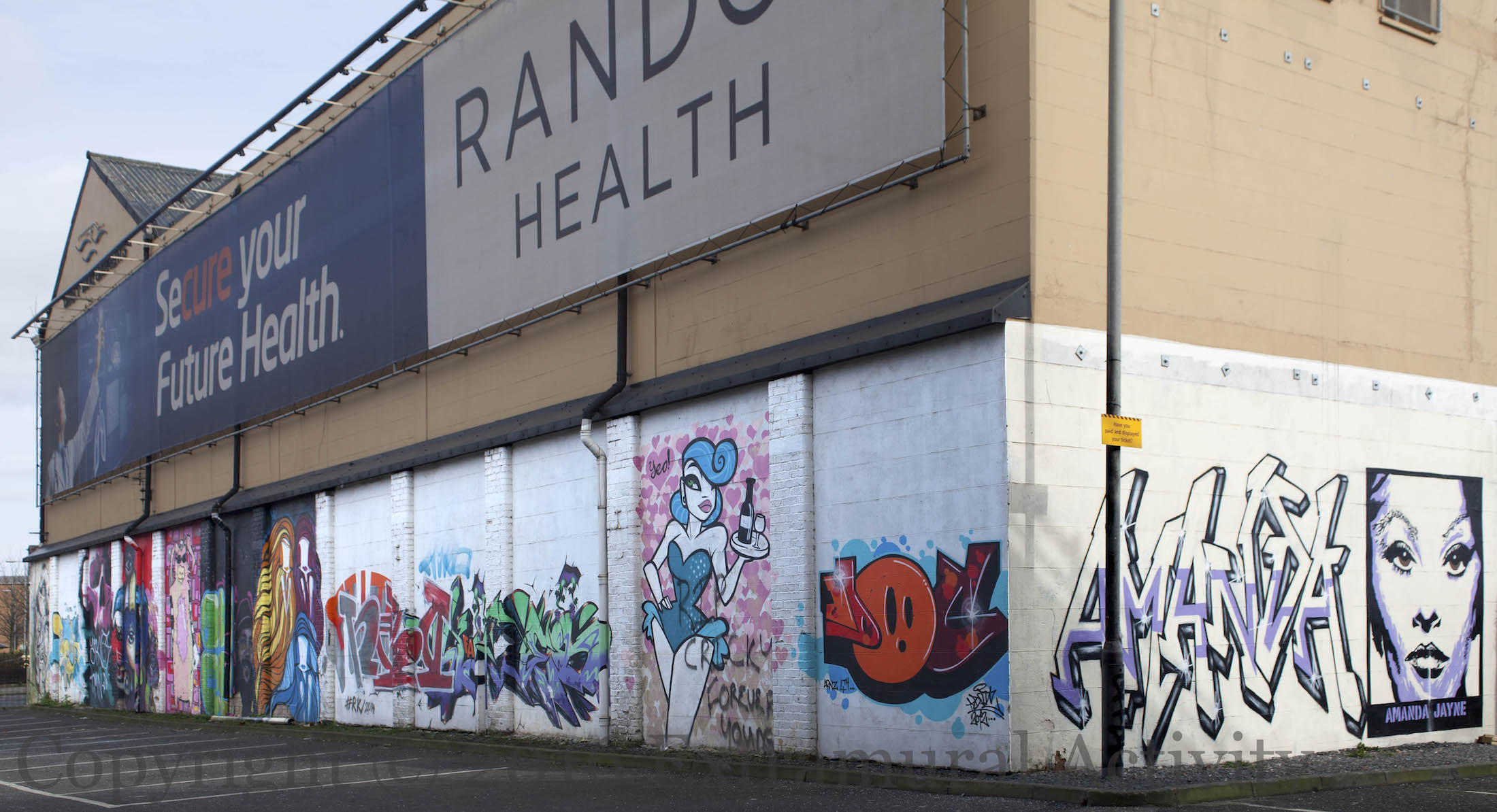 Below is a wide shot of the street art in Corporation Street prior to being covered by Glenn Molloy’s gallery of famous faces. From left to right:
