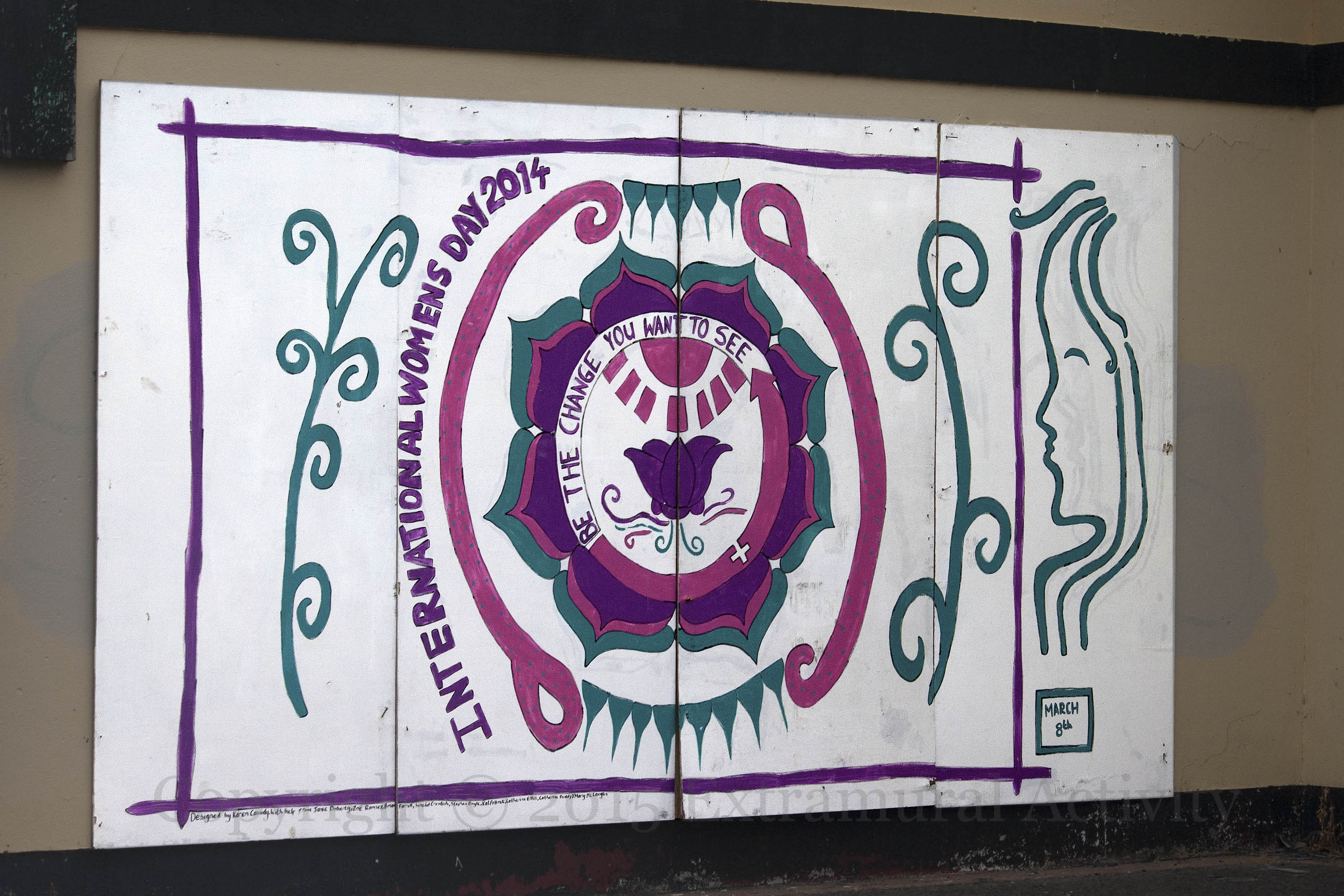 International Women’s Day, which dates as far back as 1909, is today, March 8th, 2016. Above is the 2014 mural celebrating the day in the complex of shops at London-/Derry’s Bogside Inn.