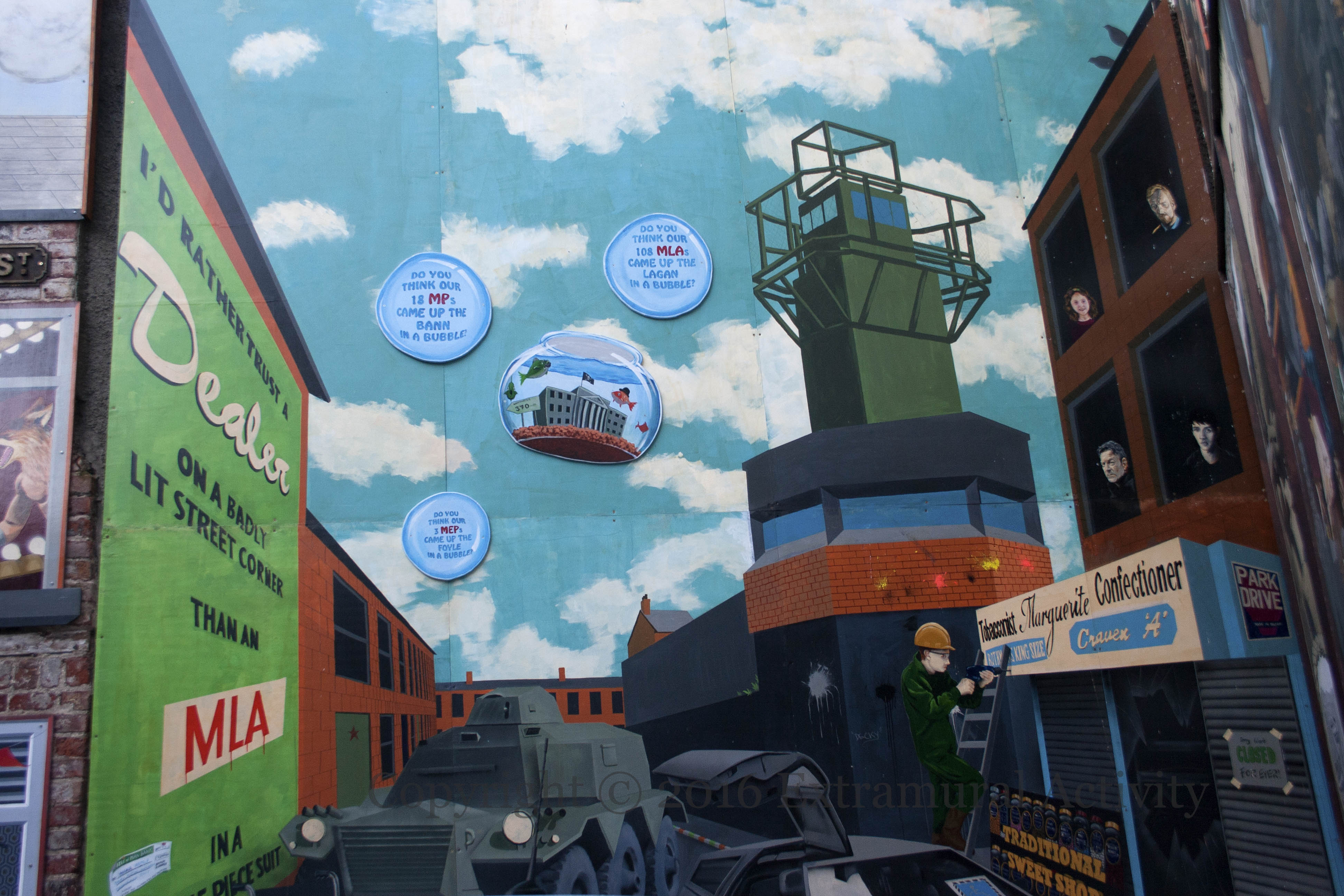 “I’d rather trust a dealer on a badly lit street corner than an MLA in a three piece suit” — a hoarding over a street containing a Saracen, a DeLorean, and a heavily fortified British Army base: The original slogan (from a Maser piece of street art in Dublin) seems to have been “… than a criminal in a three piece suit” — the substitution with “MLA” suggesting criminality in the Assembly: there’s an Isle Of Man Bank check for seven million two hundred thousand pounds, made out to “ANMLA”, drawn on the account of “Northern and Southern Ireland tax payers” in the bottom left-hand corner.
