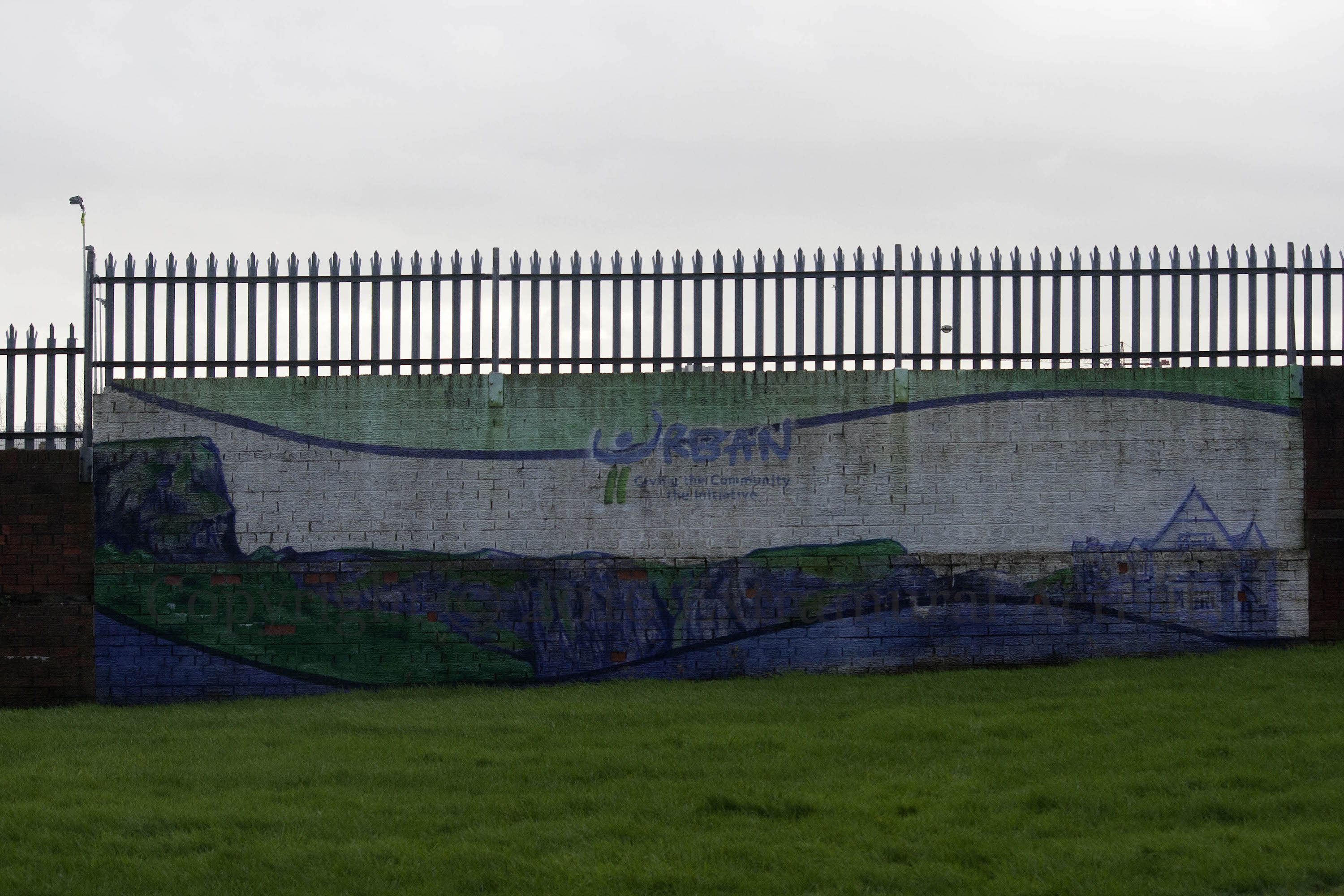 The Manor Street “peace” line dividing north Belfast’s Lower Oldpark and Cliftonville areas got a facelift in January — the beige was painted over with a sky blue colour. The wide shot, (third image, below,) gives an impression of its height and extent (and this is only the north-south part of the line.) The fourth image is of an old European Union “Urban” mural showing the north Belfast skyline, including Cave Hill (and Napoleon’s Nose) and Belfast Lough. (For more info on Urban II and the mural, see minute 17 onward in this NVTv documentary).