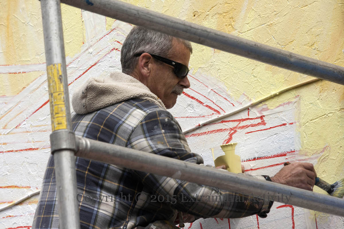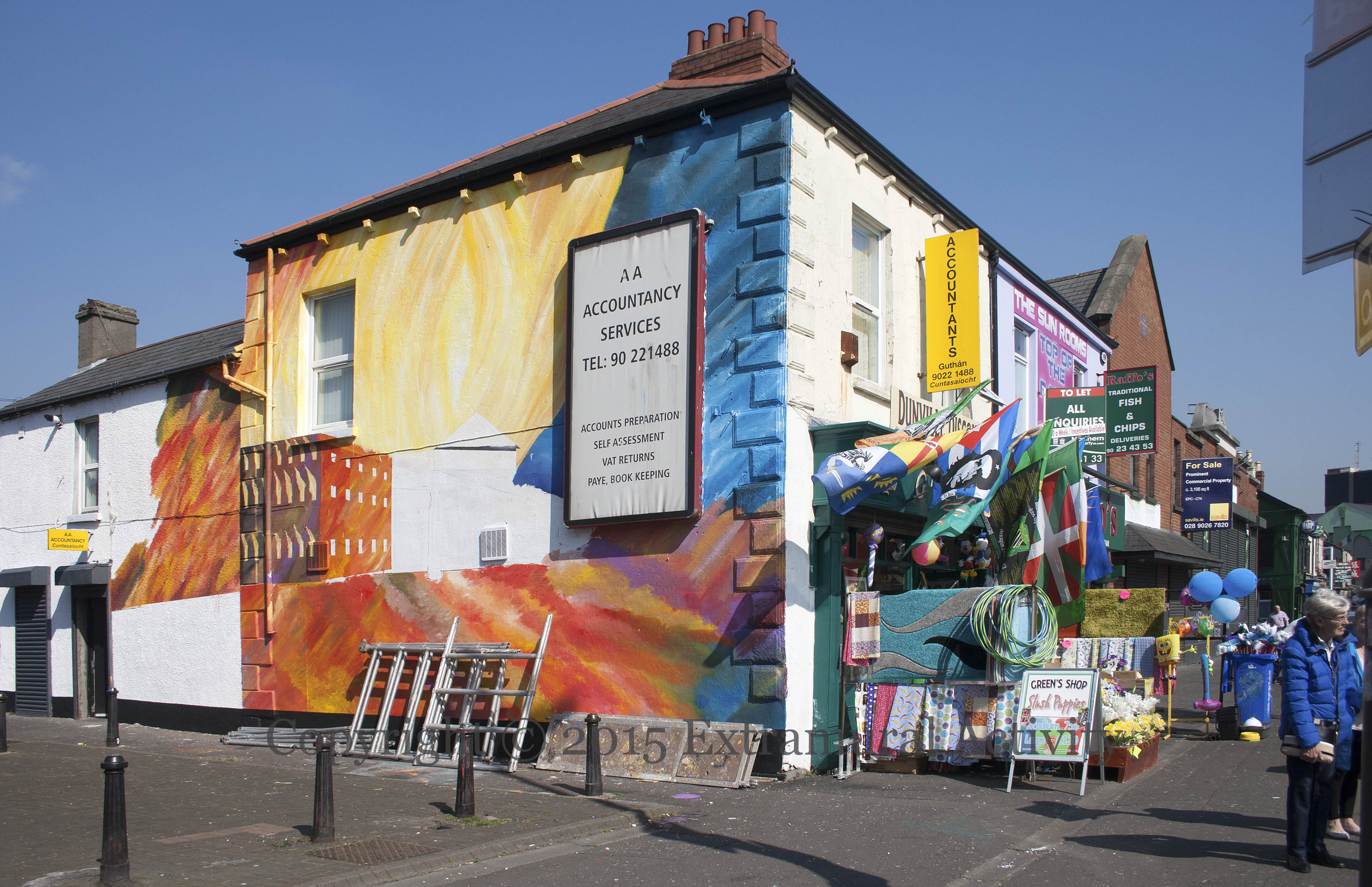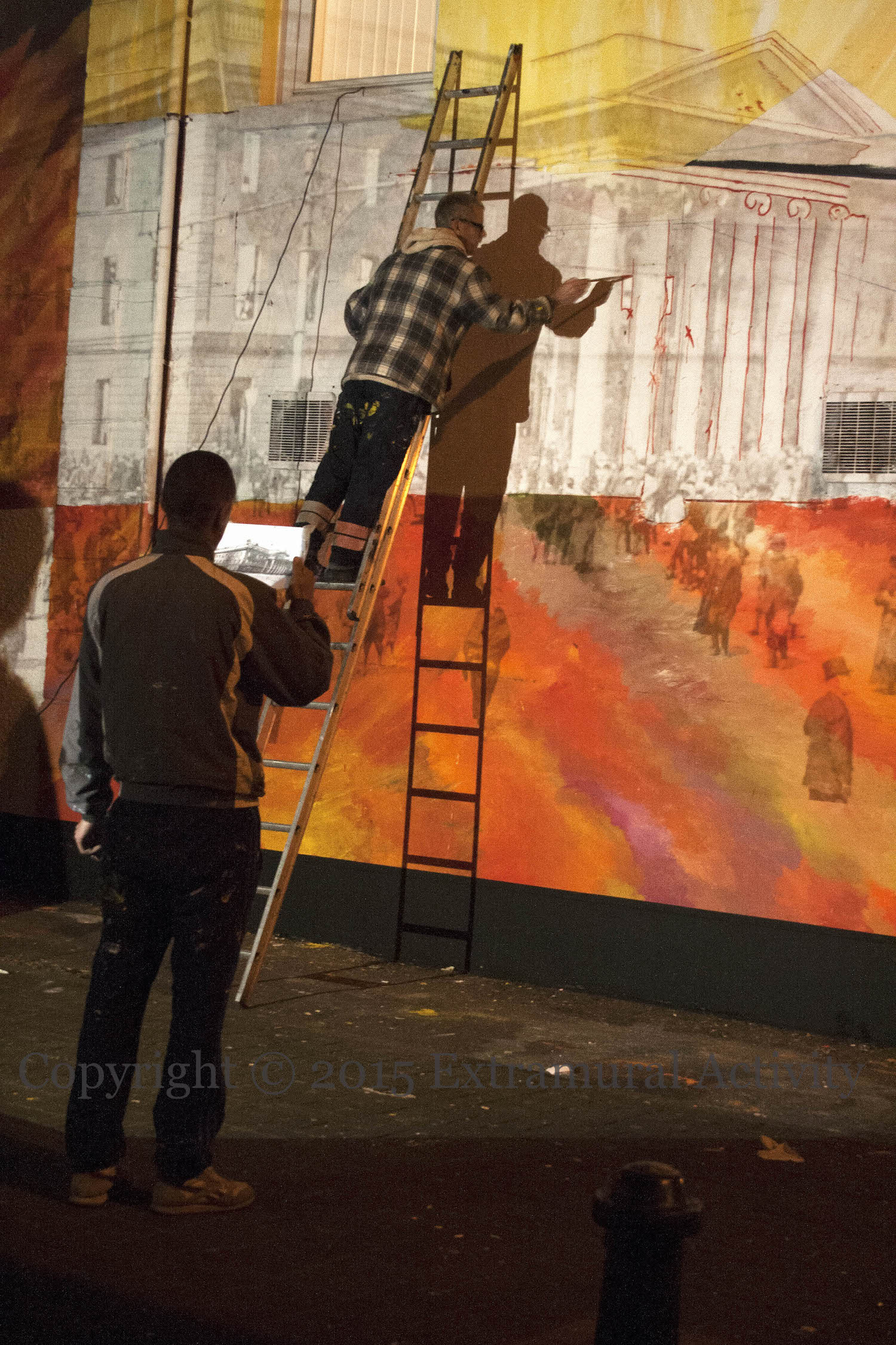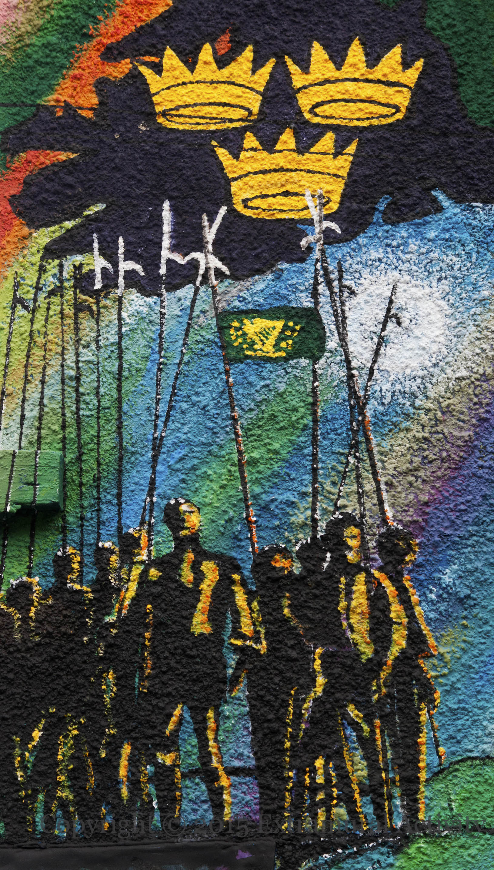 The pikemen of 1798 go into battle under the flag of the United Irishmen in a detail from a new mural on the Falls Road for the centenary of the 1916 Easter Rising. Below are work-in-progress images showing artists Gerard ‘Mo Chara’ Kelly and Bill Bradley.
