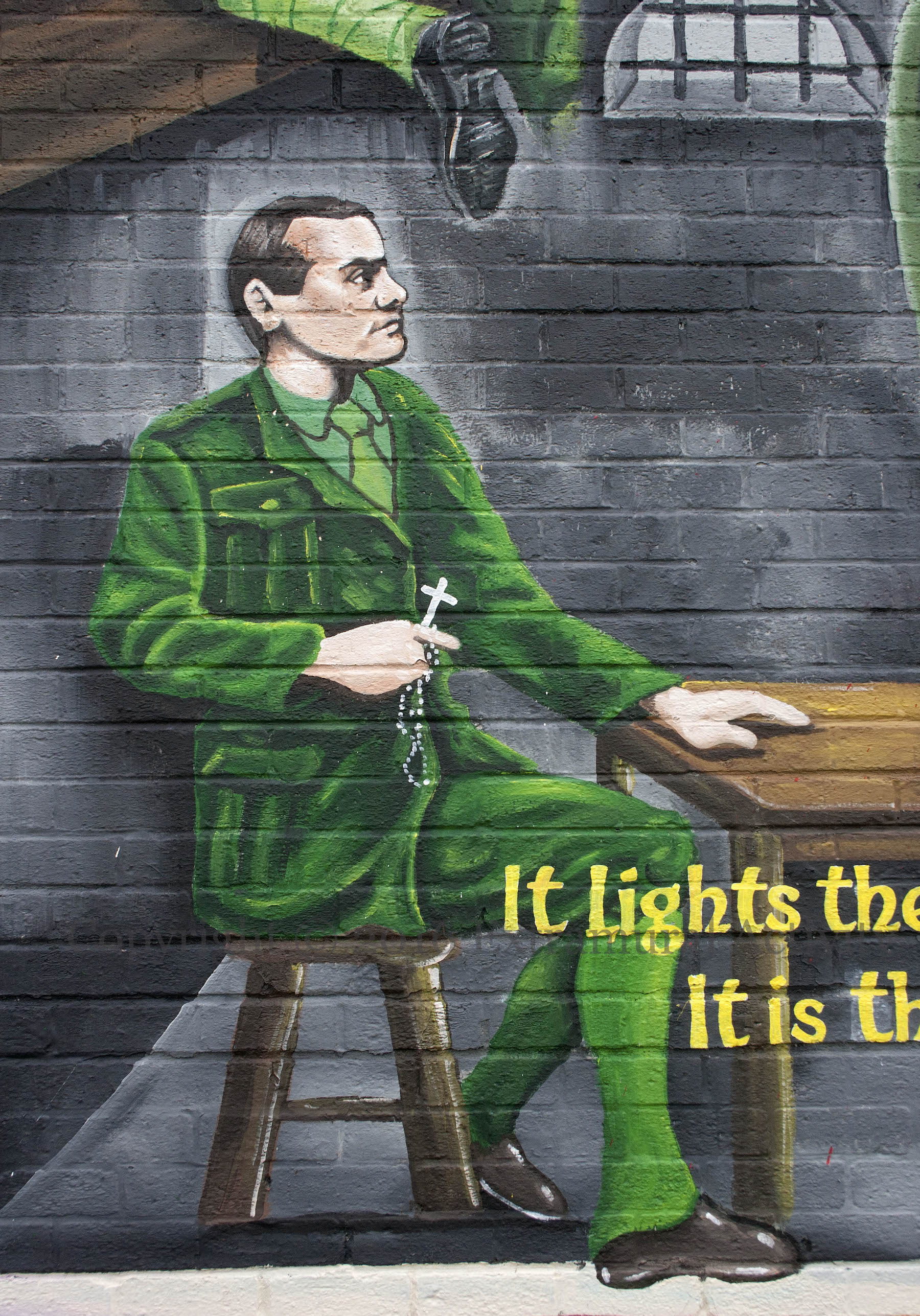A succession of Irish rebels is shown in this new mural in Andersonstown, west Belfast. It begins (top left) with the rebellion of 1798 and then to the Easter Rising of 1916 at the GPO in Dublin. In the lower left, a pious Padraıg Pearse awaits his execution with rosary beads in hand. There are then shown female figures from Cumann Na mBán and the IRA (see previously: United Irishwomen, Do You Care? and Mothering Sunday In Beechmount), and then Maıréad Farrell in Armagh Women’s Prison (for the original, see Prison Walls). In the bottom right corner there is a blanketman. The busts of Bobby Sands and Joe McDonnell float above the GPO and the last verse of Sands’s The Rhythm Of Time form the epigraph: “It lights the dark of this prison cell, it thunders forth its might, it is the undauntable thought, my friend, the thought that says, “I’m right”.