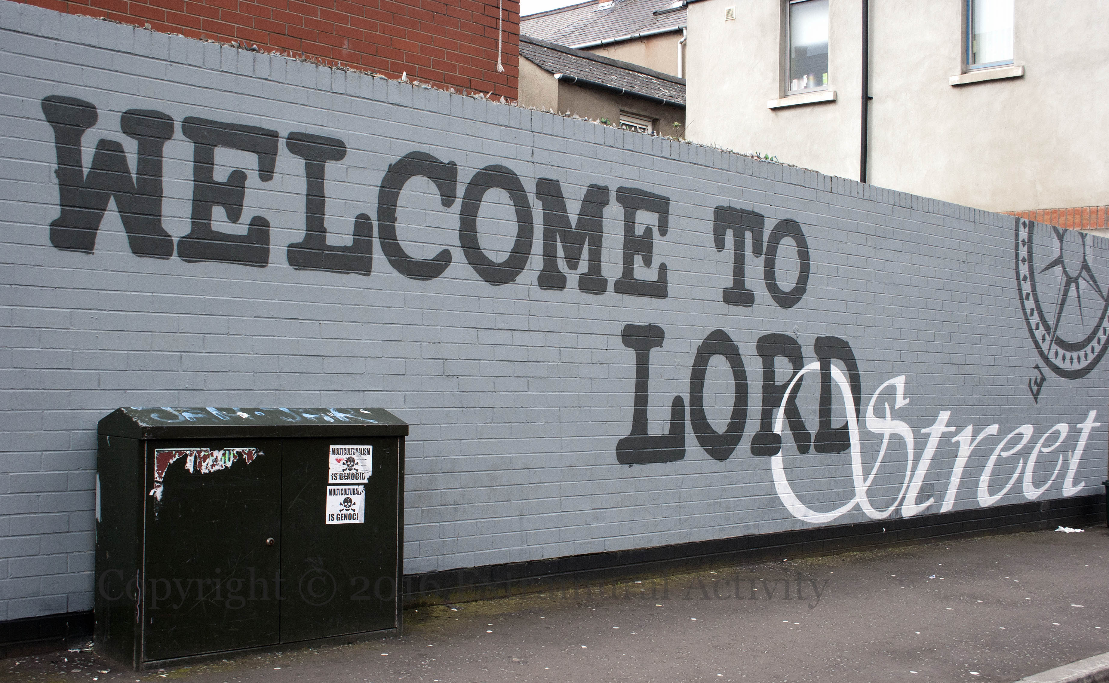 The flyers above (on an electrical box in east Belfast) have been damaged not by time and the weather but by deliberate human efforts to remove them, one by scoring and the other by peeling. The sentiment expressed – that adapting oneself and the community to the influx of foreign nationals — or at least its public expression, is thus controversial in the area.