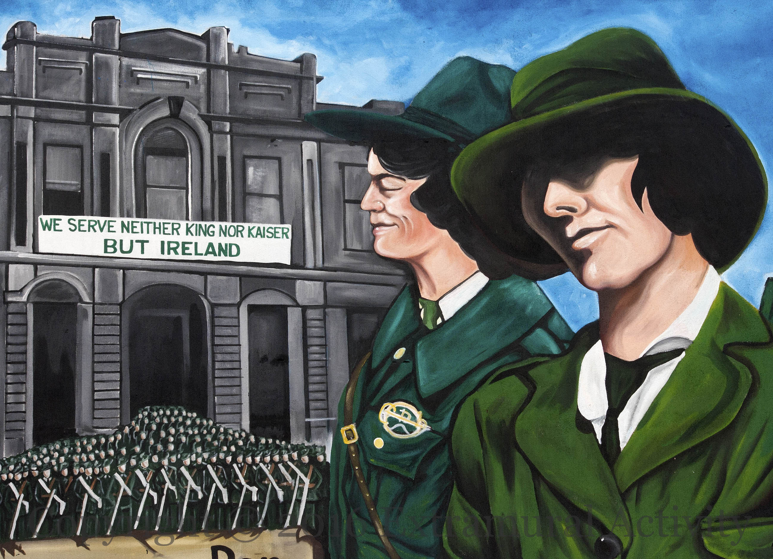 Nell (l) and Elizabeth (r) Corr from 107 Ormeau Road joined Cumann Na mBan in 1915 and travelled to Dublin in 1916 (with Nora Connolly, Ina Connolly, Bridie Farrell, Lizie Allen, Kathleen Murphy, and another girl called O’Neill (Treason Felony)) to serve as messengers in the preparations for April’s Easter Rising. They were in Liberty Hall (shown in the detail above) on the morning of the rising before heading north. Brother George, on the other hand, died at the Somme as a soldier in the Australian infantry, while another brother, Charles, fought in WWI with the Canadian Expeditionary Force. They are pictured on the left-hand side of the mural. (BBCBBC video) There are two images of the work in-progress at the bottom of the post.