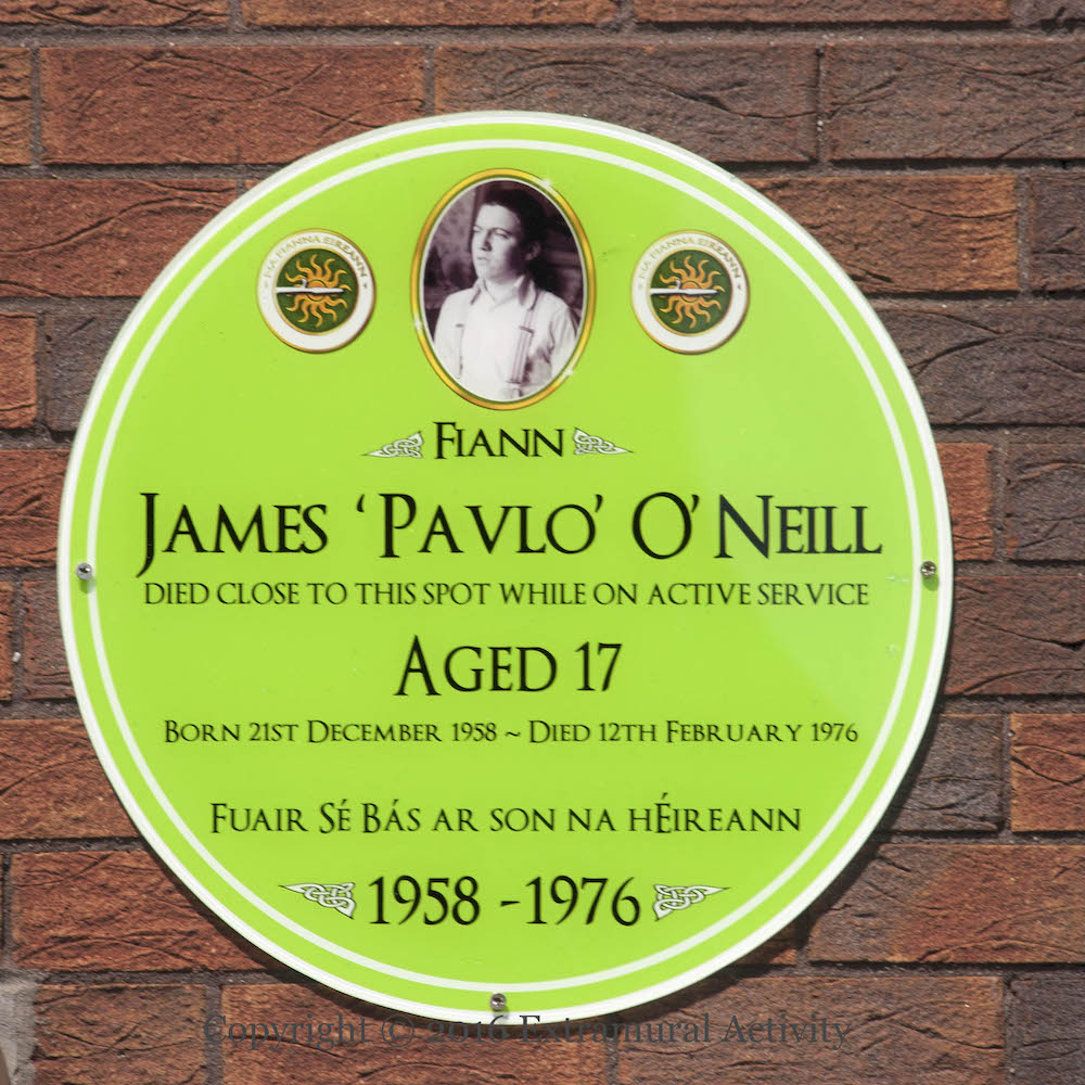 “Fıann [sic] James ‘Pavlo’ O’Neill died close to this spot while on active service, aged 17. Born 21st December 1958 – died 12th February 1976. Fuaır sé bás ar son na hÉıreann. 1958-1976”. Jim O’Neill was killed in during an IRA arson attack on a furniture warehouse on the Antrim Road near the New Lodge – Gerry Fitt’s house next door might have been the ultimate target (Belfast Child). The local flute band is in part named after him – see O’Neill-Allsopp Memorial Flute Band.