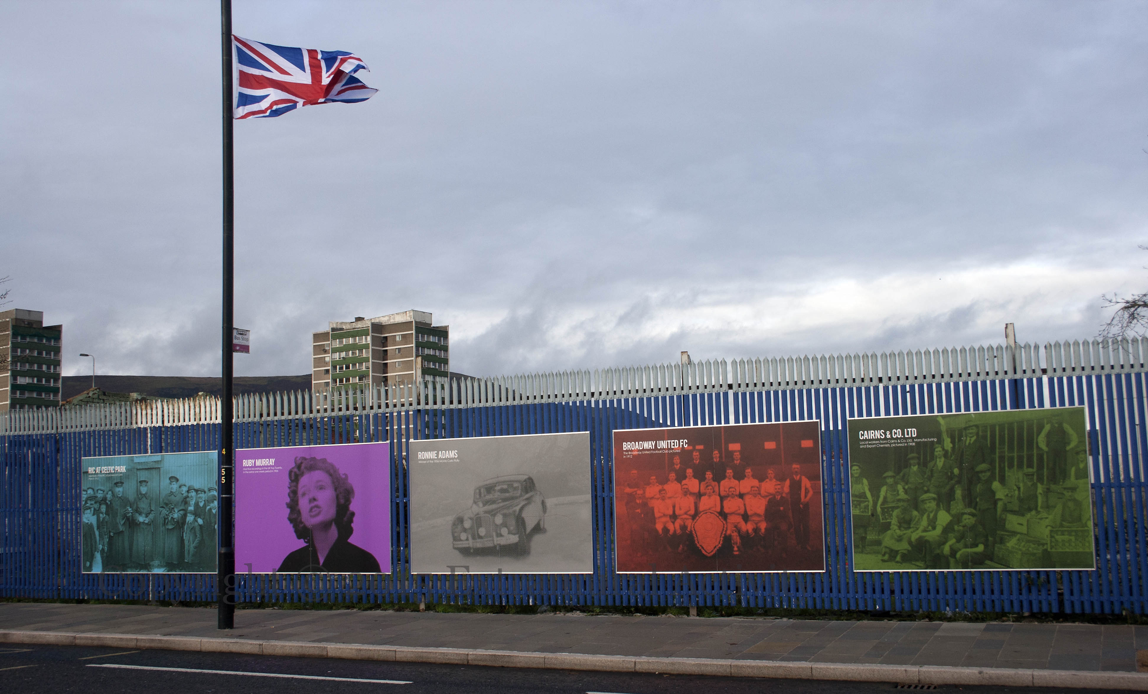 This post is the fifth and final board on Donegall Road. In order of the wide shot, below, the five are: RIC At Celtic Park | Ruby Murray | Ronnie Adams | Broadway United FC | Cairns & Co. Ltd