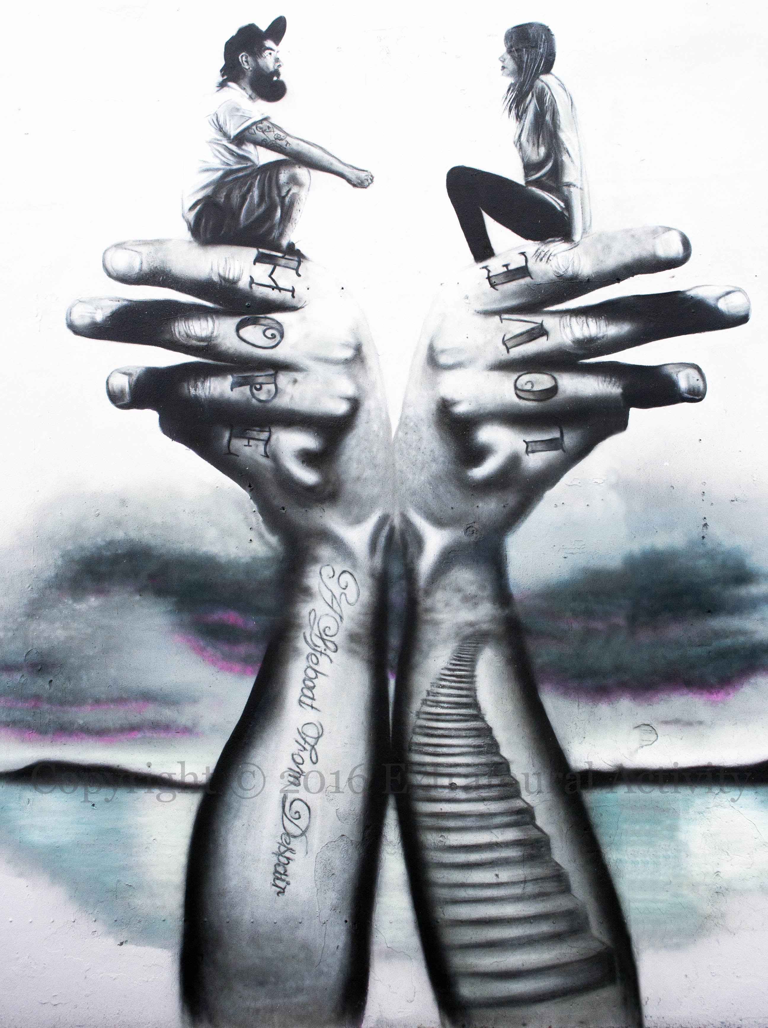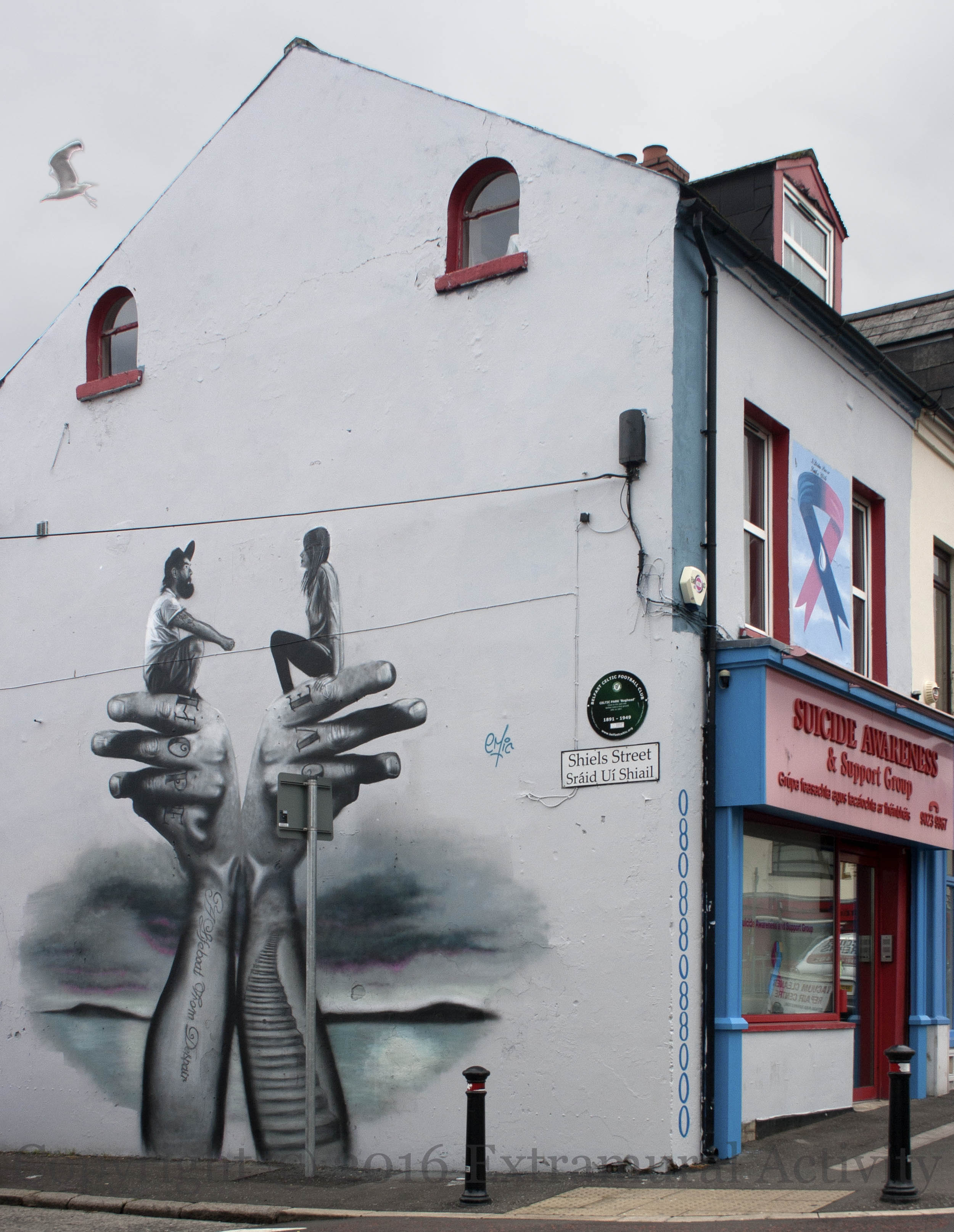 emic (Eoin McGinn Fb | Web |Tw) has been at work on the Falls Road painting a mural for the Suicide Awareness & Support Group. Two figures face each other, seated on the index fingers of hands tattooed with “hope” and “love”. Wide shot below.