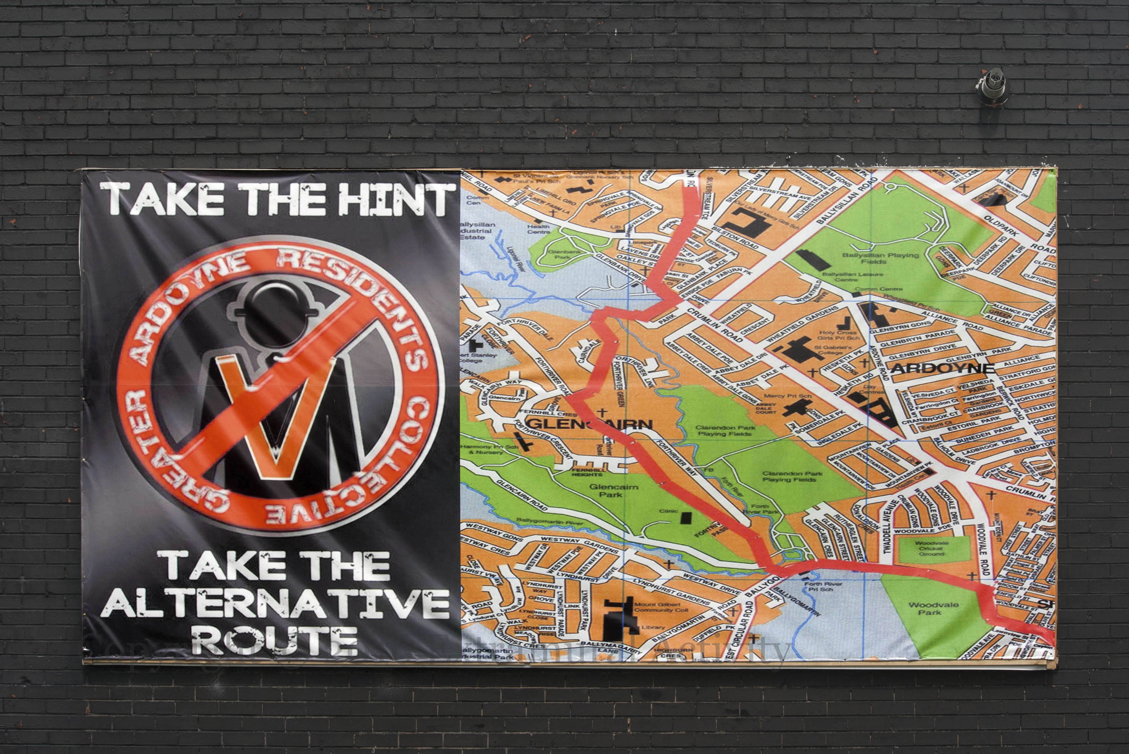 A deal to end the standoff at Twaddell Avenue, where an Orange Order parade was stopped in 2013, fell though a few days before the proposed July 1st march date (BelTel). The GARC (Greater Ardoyne Residents Collective) tarp shown above maps out an alternative route that would bypass the Ardoyne shops.