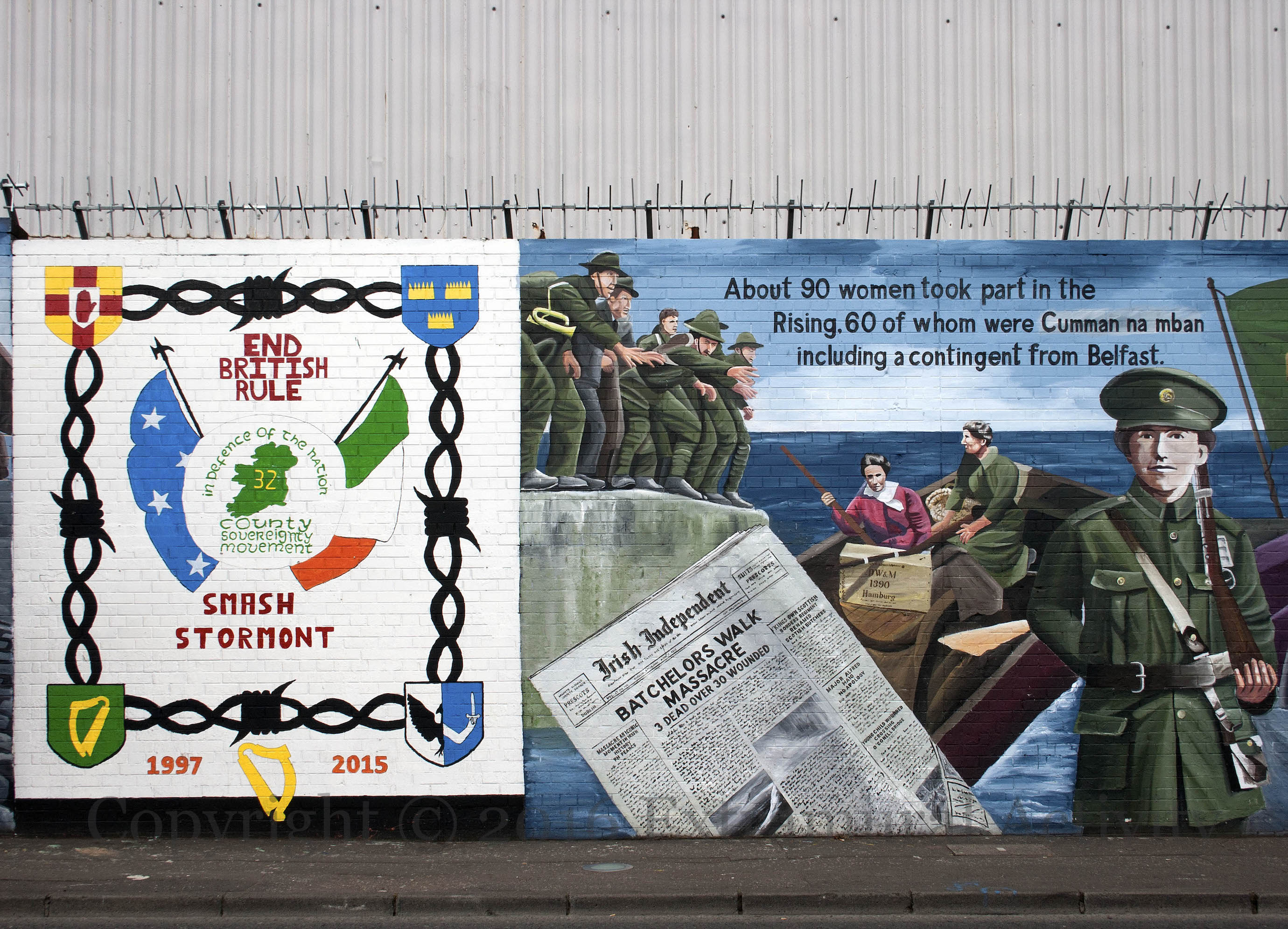 We understand that the painters offered to repaint the 32CSM mural after the historical mural had been in place for six months, but that this offer was turned down. For the purposes of the launch, then, a cloth sign, was hung over the 32CSM mural (as seen in the image above). It reproduces a poster (see the original) advertising “a public meeting for the formation of Irish Volunteers”; Eoin MacNeill, author in November 1913 of ‘The North Began’, presided at the meeting – here is the text of The North Began – and the newspaper carried by the hawker on the left reads “MacNeill successful in call for Irish Volunteers” (whereas it originally read “Rotunda rally – Irish volunteers now exceed 180,000” as can be seen in the Carson post). However, this cloth was removed immediately after the launch, meaning that the wall appears as in the image below.