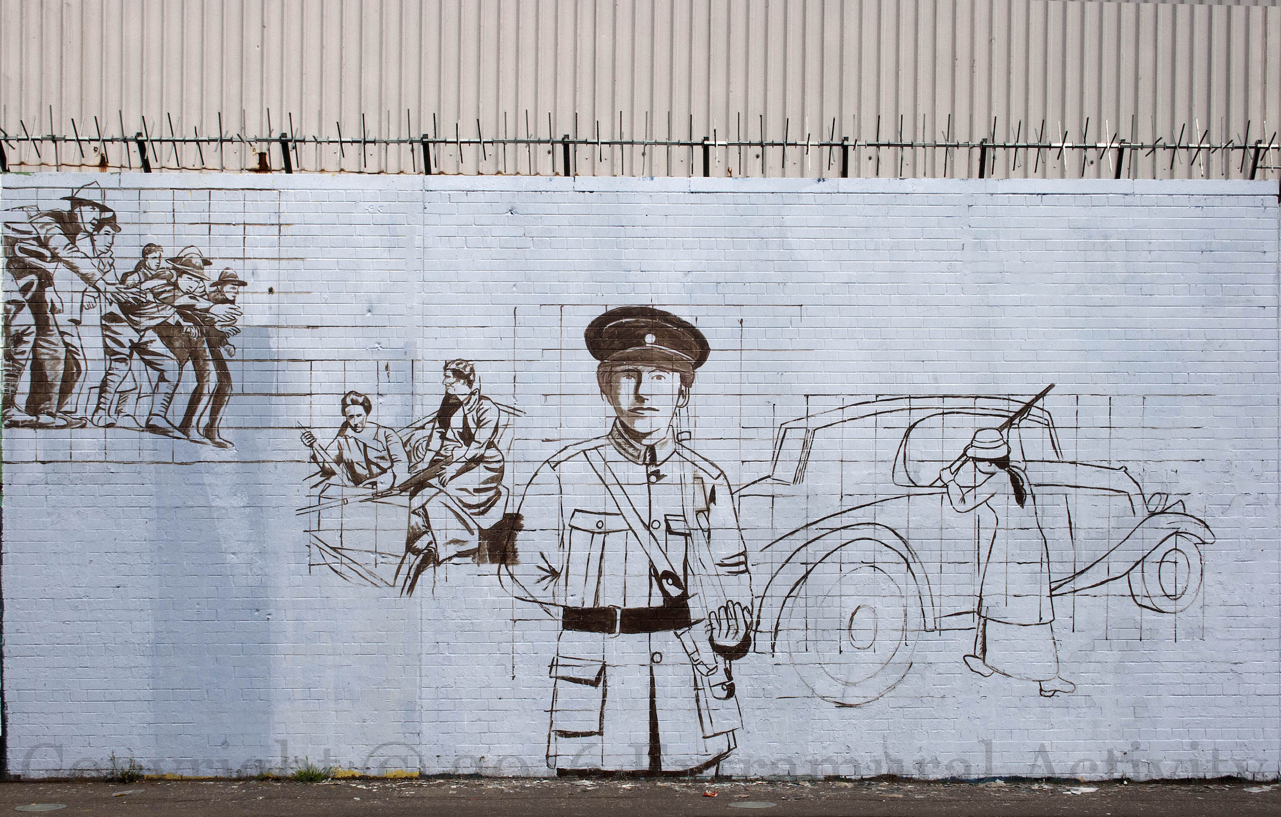 Nora Connolly in her Cumann Na mBan uniform is the centre point of the ‘Howth Gun-Running’ panel in the new mural on the International Wall. Her sister, Ina, is shown to the right, unloading a rifle from a car outside their home in Glenalina Terrace. About 1,500 rifles were smuggled into Ireland on two boats, 900 of them on the yacht, Asgard, shown left-of-centre with Molly Childers and Mary Spring Rice aboard (the latter kept a diary of the trip; extracts are included in this RTÉ History Show video). Asgard docked at Howth on July 26th, 1914. (Here is a tcd.ie collection of images of Asgard’s journey; image #53 is the one reproduced in the mural). The other rifles eventually came ashore two weeks later at Kilcoole. (See this RTÉ article for an account of their tortured journey.)