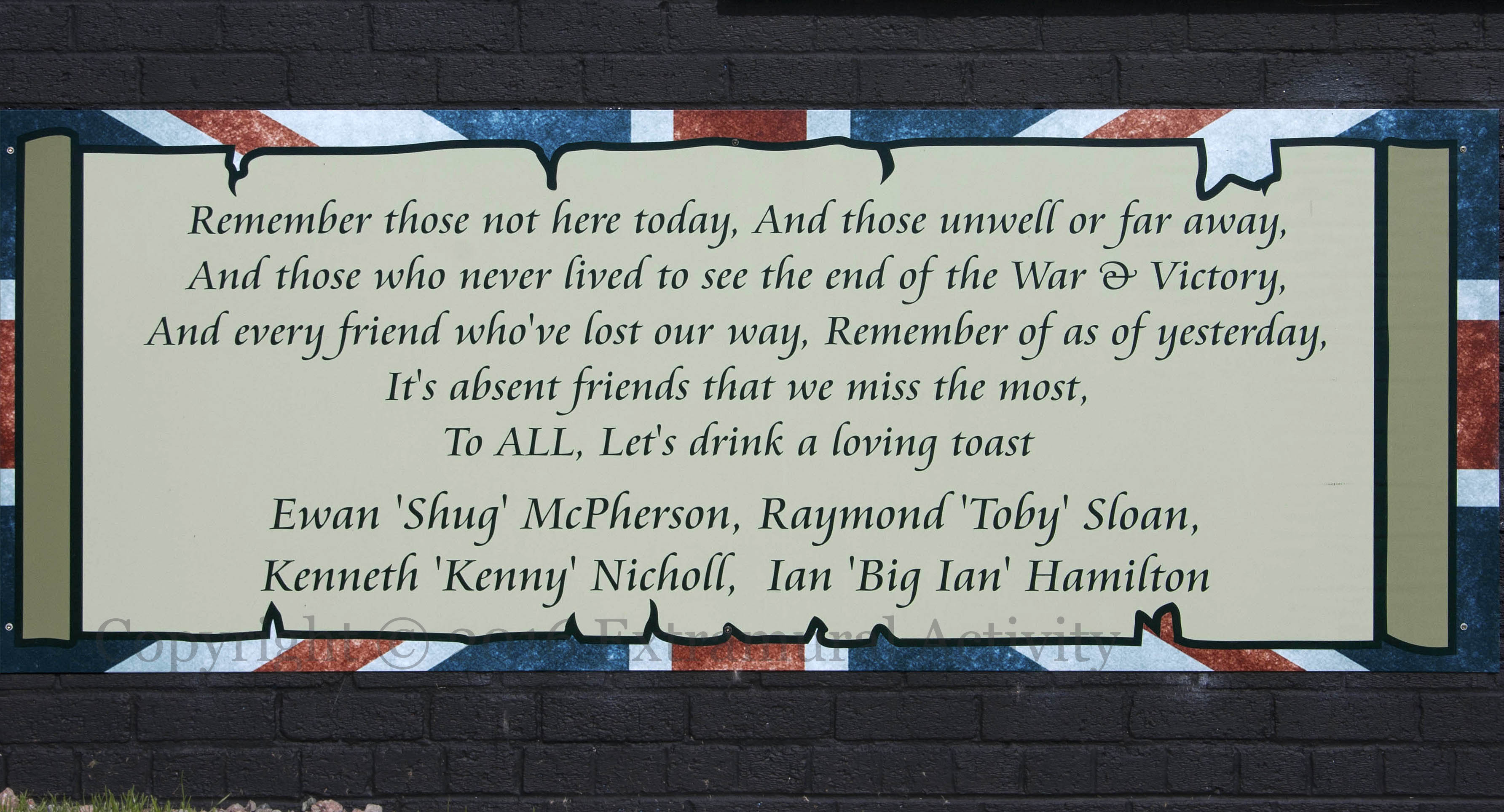 “Remember those not here today, And those unwell or far away, And those who never lived to see the end of the War & Victory, And every friend who’ve lost [or: passed] our way, Remember as of yesterday, It’s absent friends we miss the most, To ALL, Let’s drink a loving toast.”