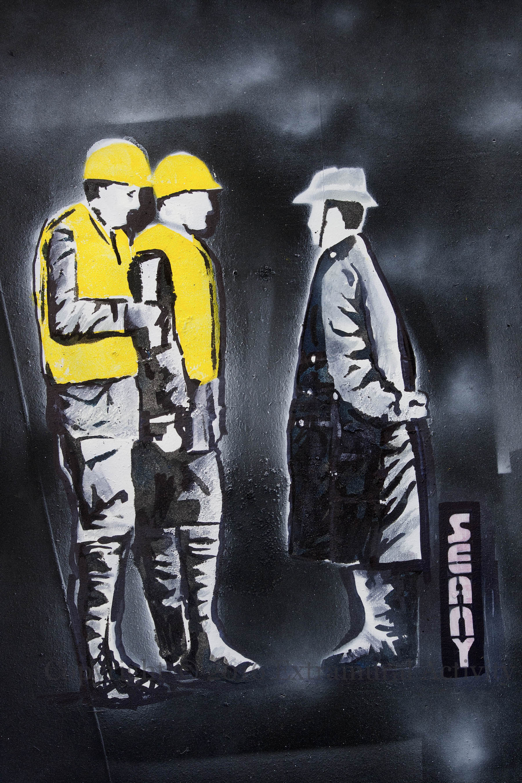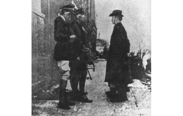 The stencil is based on the image – third below – of Padraig Pearse and Elizabeth O’Farrell surrendering to the British General Lowe. The piece was ‘signed’ by Banksy, though it was immediately suspected to be not by Banksy, as he had not signed any pieces for some years, and indeed, Banksy denied that it was his (e.g. Irish Times) and Will St Ledger wished that the artist had had the confidence to claim it as their own (RTÉ).