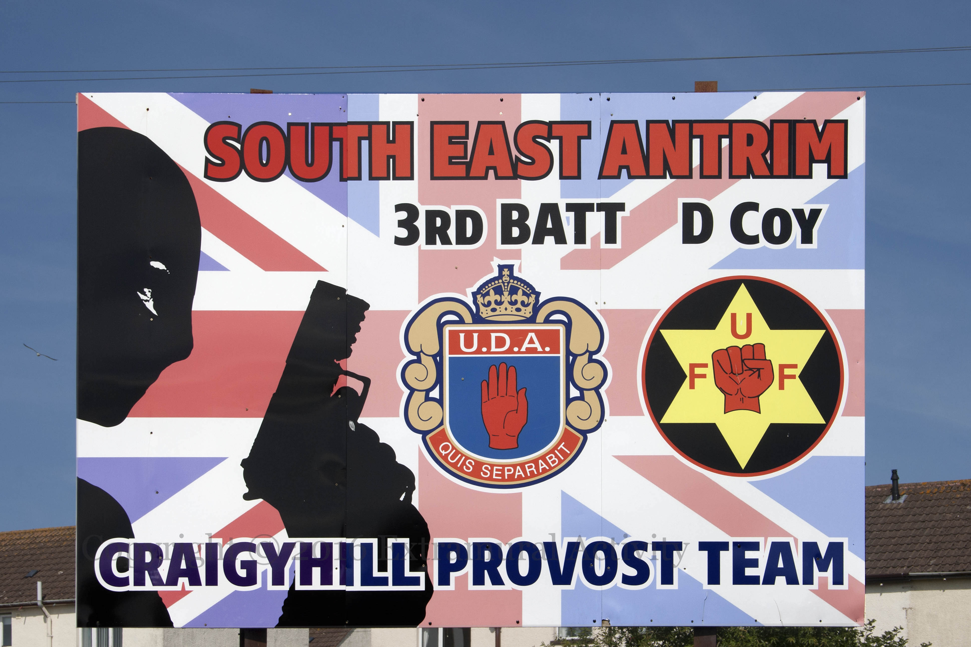 There was some consternation (Larne Times) when the UDA/UFF board (shown above) with a silhouetted paramilitary holding a pistol was set up in late 2014, but the board remains in place in the summer of 2016. “South East Antrim 3rd Batt., D Coy.” If you know what “provost team” means, please let us know.