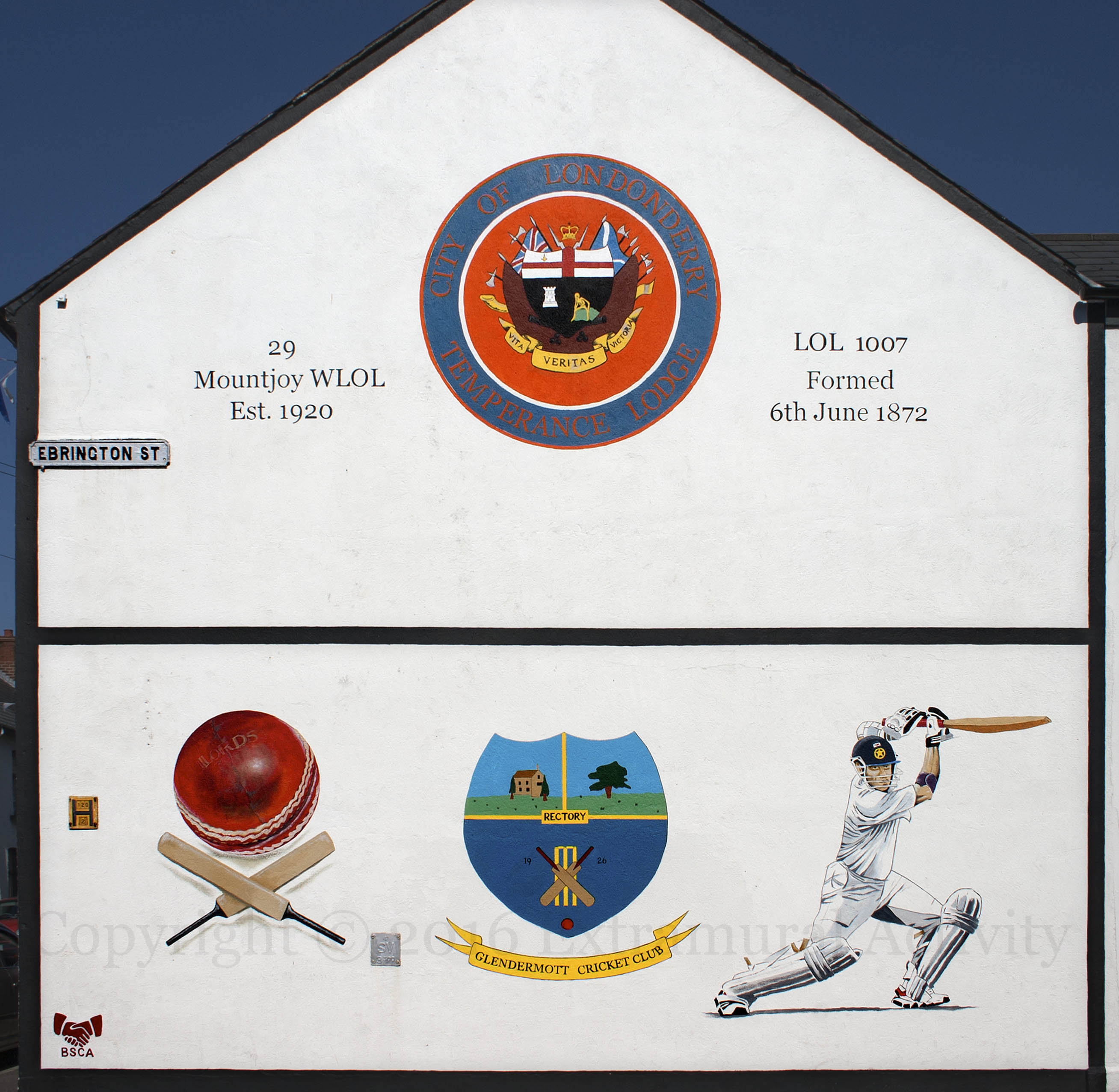 The mural above in Londonderry’s Ebrington Street celebrates three local organisations: in the upper portion, Orange Lodge “City Of Temperance” lodge (web) and Women’s Lodge “Mountjoy”; in the lower portion, Glendermott Cricket Club (Tw), whose home pitch is Rectory Field (shown on the shield in the middle).