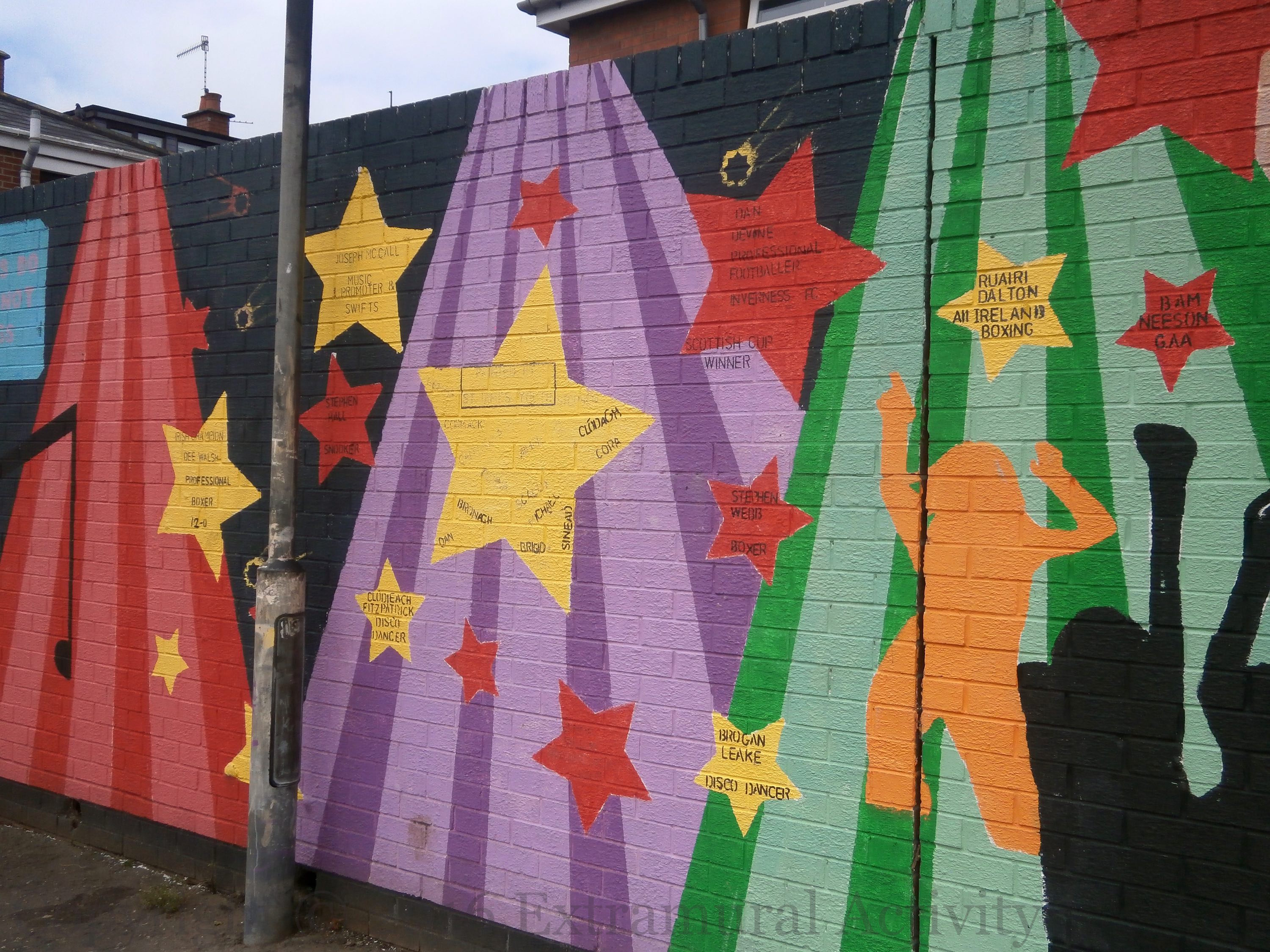 Five images of the St. James Youth mural on Rodney Parade across from the farm: “Music is our drug – R speaker is R dealer” and “Mates do hugs, not drugs”.